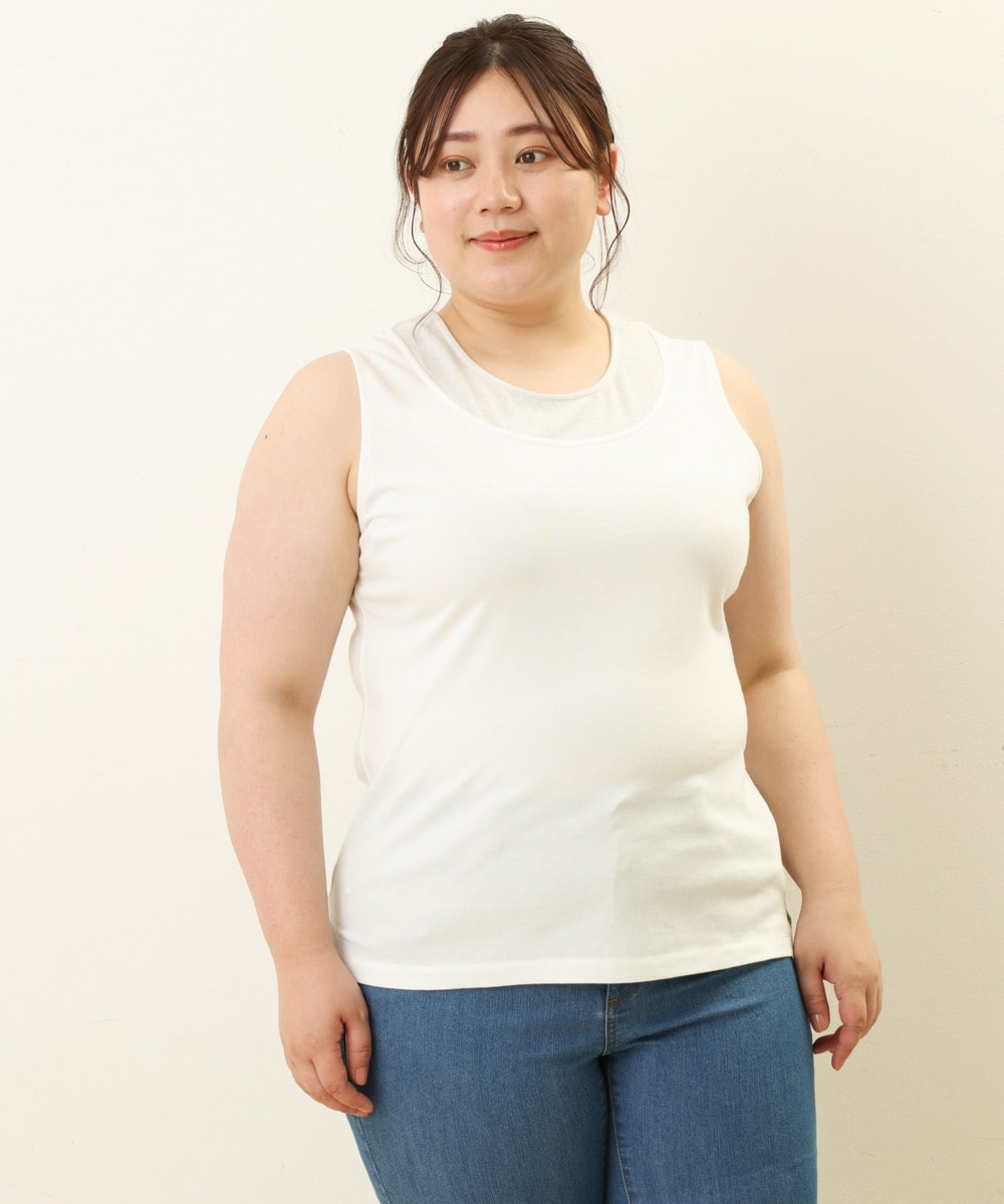 首元が開きすぎないタイプのタンクトップです。襟ぐりにラメが入っているので、華やかな印象になります。