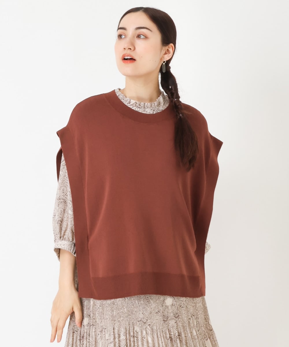 ニットベストとプリーツスカートの組み合わせにトレンドのシアーカットソーをレイヤードして着用しています。