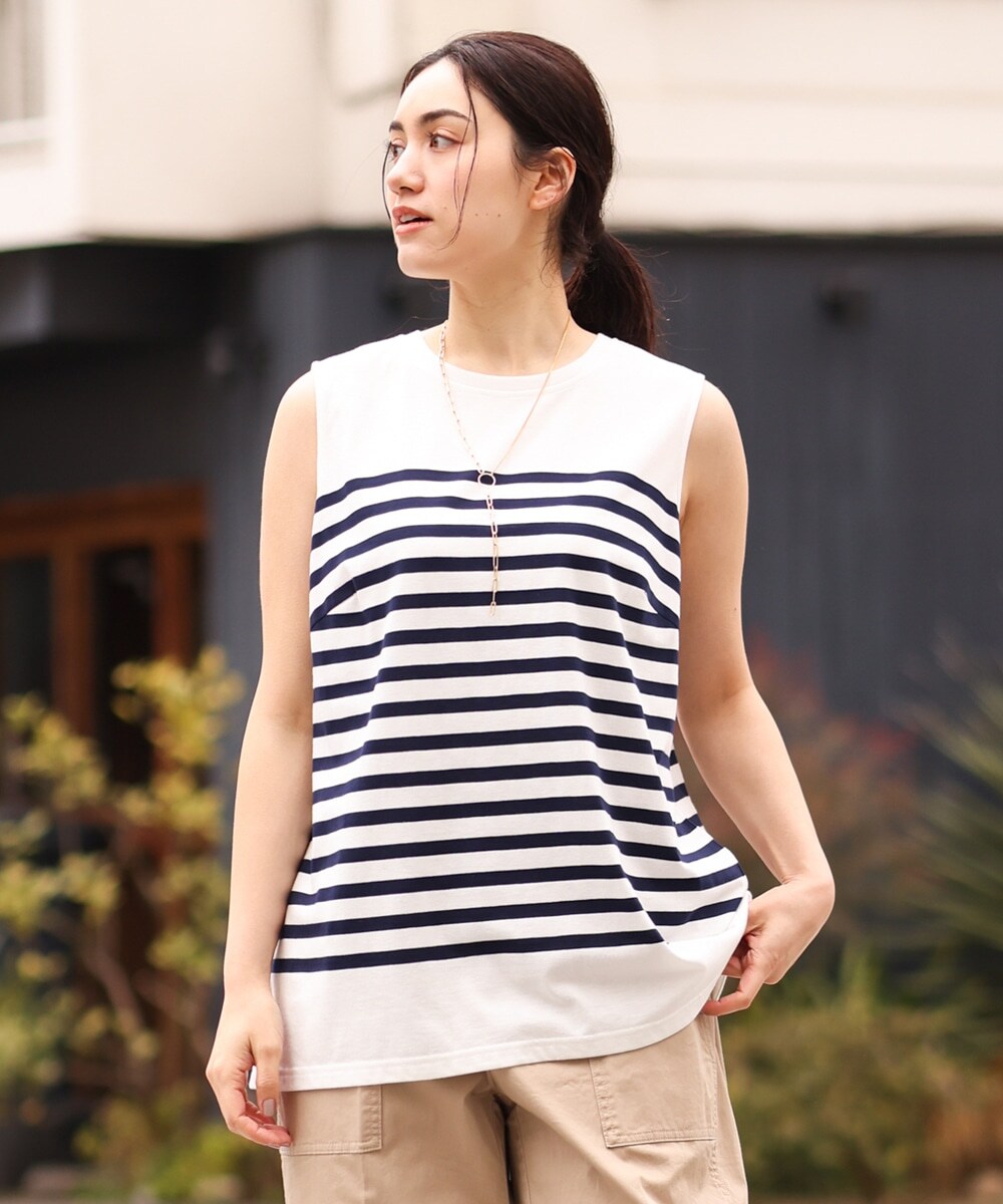 クルーネックで肩幅も下着が見えない安心なべーシックなノースリーブトップス。シャツやカーディガンのインナーとしてもバランスよく着ていただける長め丈です。