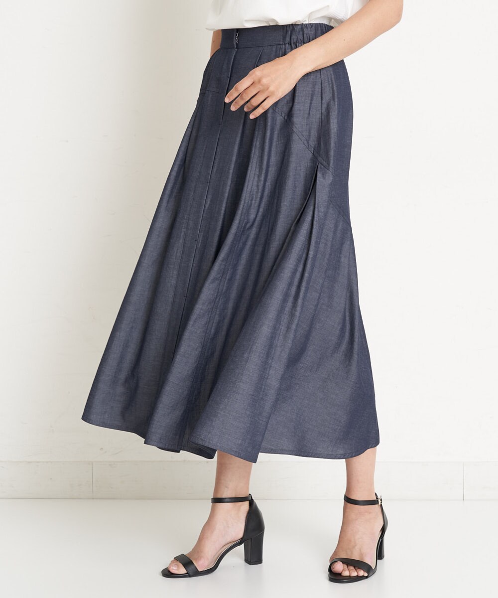 スカートはサラリとした清涼感のあるドライタッチで、軽さと落ち感を兼ね備えたシャンブレーデニム見え素材です。きれいなシルエットです。