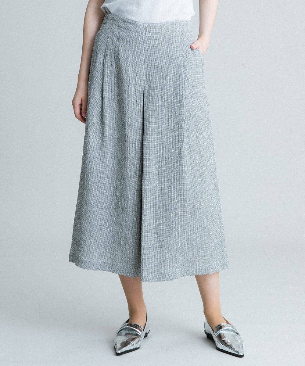 先染めのミジンチェック柄の爽やかなガウチョパンツです。フロントにタックを施しウエストはスッキリ、後ろのみゴム仕様でより綺麗なシルエットになっています。