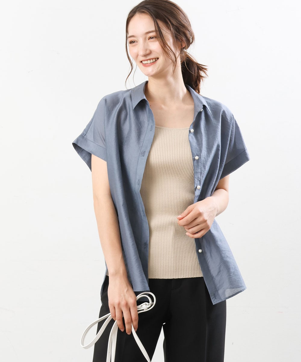 フェイクパール釦をあしらったシャツブラウスは第一釦を外して少し後ろに抜いて着ても、上まで釦を全部留めて着ても首にゆとりのあるサイズ感に仕上げました。また、前立て下にある釦ホールを裏の釦に通すと、フロントインしているかのようなスタイリングも楽しめます。