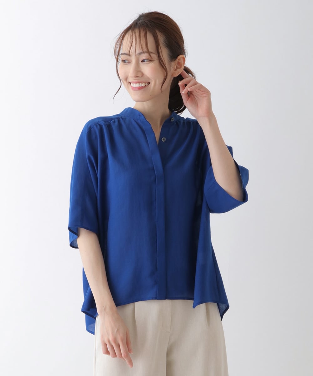 着心地:パキっとしたブルーで見た目から爽やかな一枚。イレギュラーなヘムラインがニュアンシーで他と差がつきます。二の腕をさり気なくカバーしてくれる袖丈です。