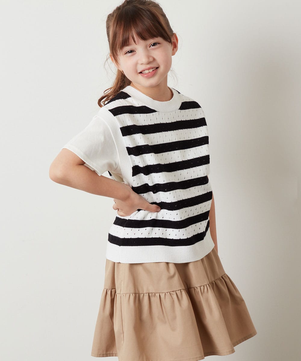 ○ベスト&Tシャツ2点セット 身長158普段160着用160 ベストの編み方が涼し気で夏っぽいです◎ Tシャツがセットになっているので、迷わずすぐに着られて時短になります♫ 別々にも着回せて着回し力抜群です♪ ワイドサロペットパンツを合わせた、大人っぽカジュアルスタイルは高学年のお子様にオススメです♪ プリーツスカートやキュロットを合わせた可愛いコーデは低学年のお子様にもオススメです◎ プレゼントにも喜ばれています♫ ○ラッププリーツキュロット 身長158普段160着用160 大人なデザイン、プリーツキュロットです♪ おしゃれ女子にオススメです◎ プリーツスカートに見えますがパンツなので学校や、公園でも大活躍します◎ ロゴTシャツ、スパンコールTシャツ、ポコポコトップスなど、トップスを選ばないのでコーデしやすいです♫ ウエストゴムで楽ちんです◎ ○シンプルなベルトサンダル 普段23.5/着用レディース24.5 ベルトの下にクッションがあり、痛くならないデザインで履きやすいです。 デニムパンツはもちろん、柄スカートや、ワンピース、どんなアイテムと合わせてもマッチする万能アイテムです!