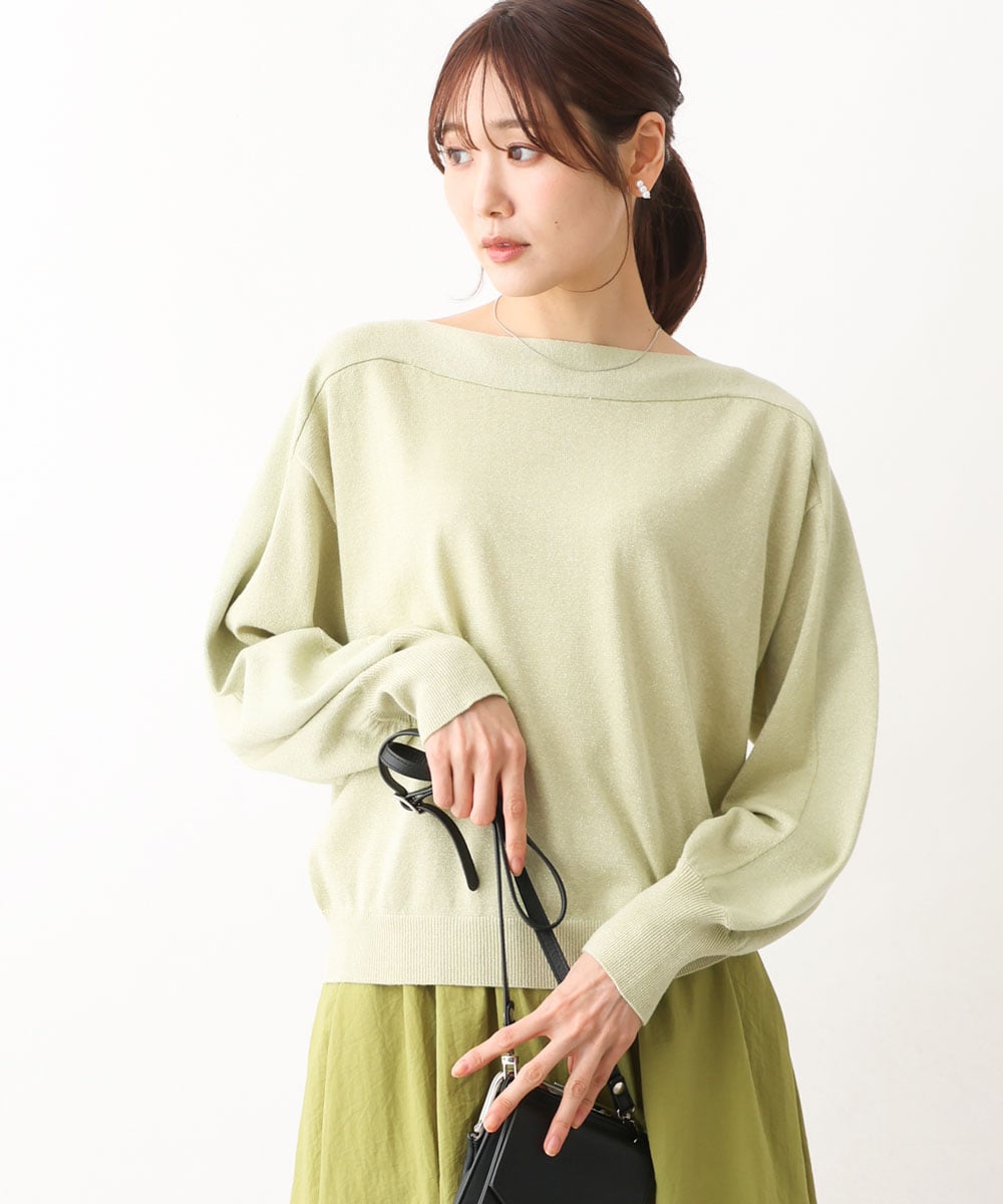 着用感:軽くて柔かいストレッチ性があり、肌に当たる裏面にラメが出ない編み方になっているのでチクチク感もなく、さらっと着心地のよいニットプルオーバー。少しコンパクトめな丈感で合わせるボトムを選ばず、スッキリと着こなせます。ボートネック×ドルマンスリーブデザインがさりげなく女性らしい印象に。今季トレンドのラメニットは、取り入れるだけで今っぽいスタイルが完成します。