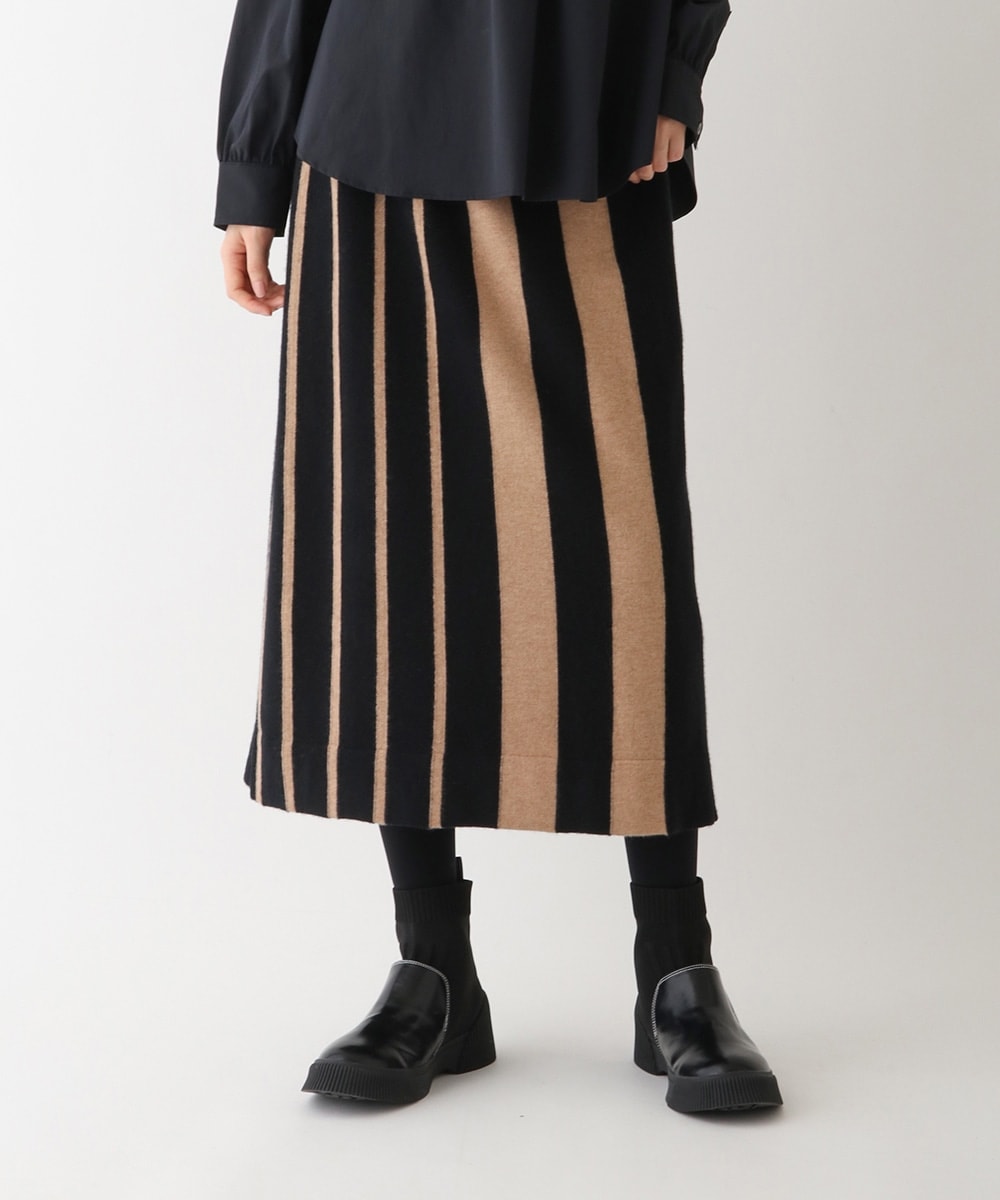 優しい着心地のアシメトリーなストライプデザインニットは同素材とのセットアップがおすすめです。履き心地抜群のニットブーツもおすすめです。 着用は9号サイズ ブーツ22.5㎝です。