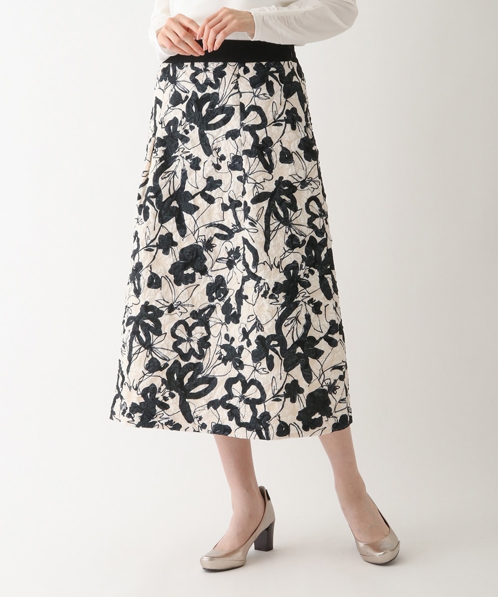 タフタとチュールを使い合わせ刺繍カッティングしたパーツをドットの編柄の上にあしらったニットプルオーバーに柔らかく軽い着心地のエコファーベスト、上品で可愛い花柄スカートを合わせました。メタルとフロッキー加工のパーツをミックスした立体感の出るネックレス、履き心地抜群のニットブーツもおすすめです。
