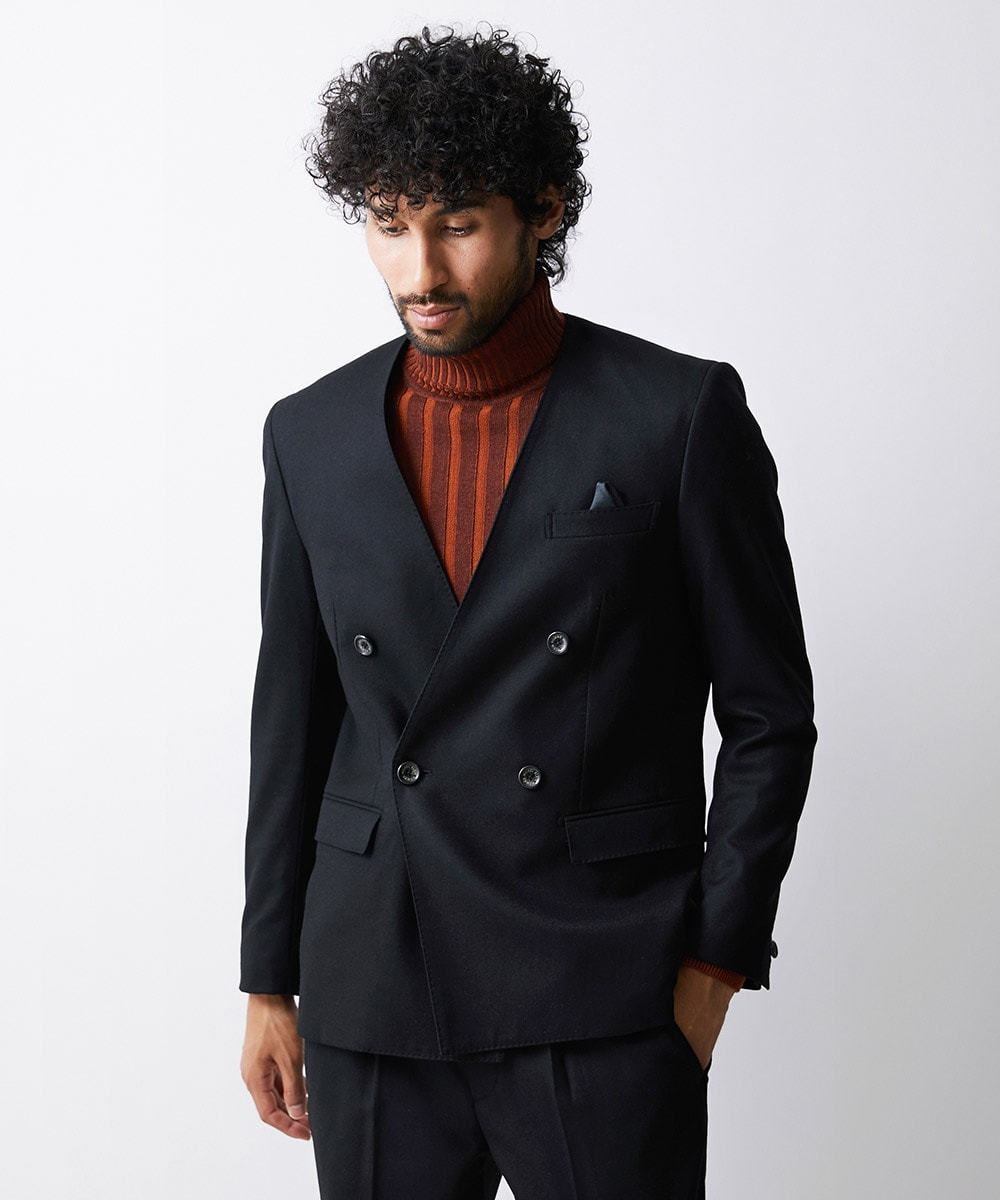 一格上のULTIMAラベルのノーカラーダブルジャケットセットアップ