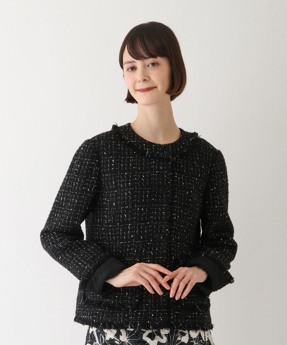 エレガンスなツィードジャケットはコンパクトなデザインでさっと羽織るだけでコーディネートが決まります。肌触りの良いピーチサテン素材のチュニックとウエストゴムの楽ちんスカートとのセットアップがおすすめです。