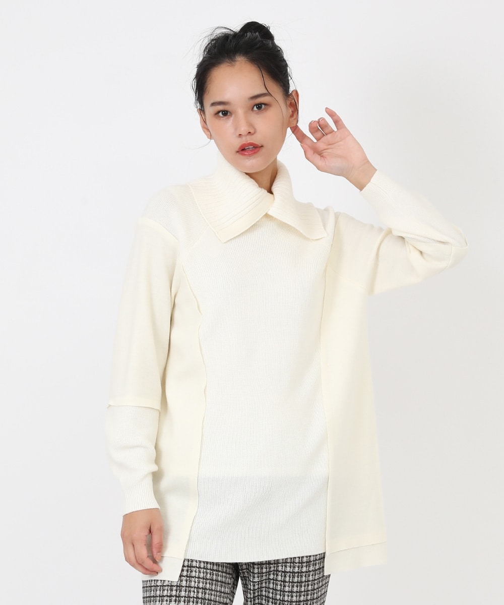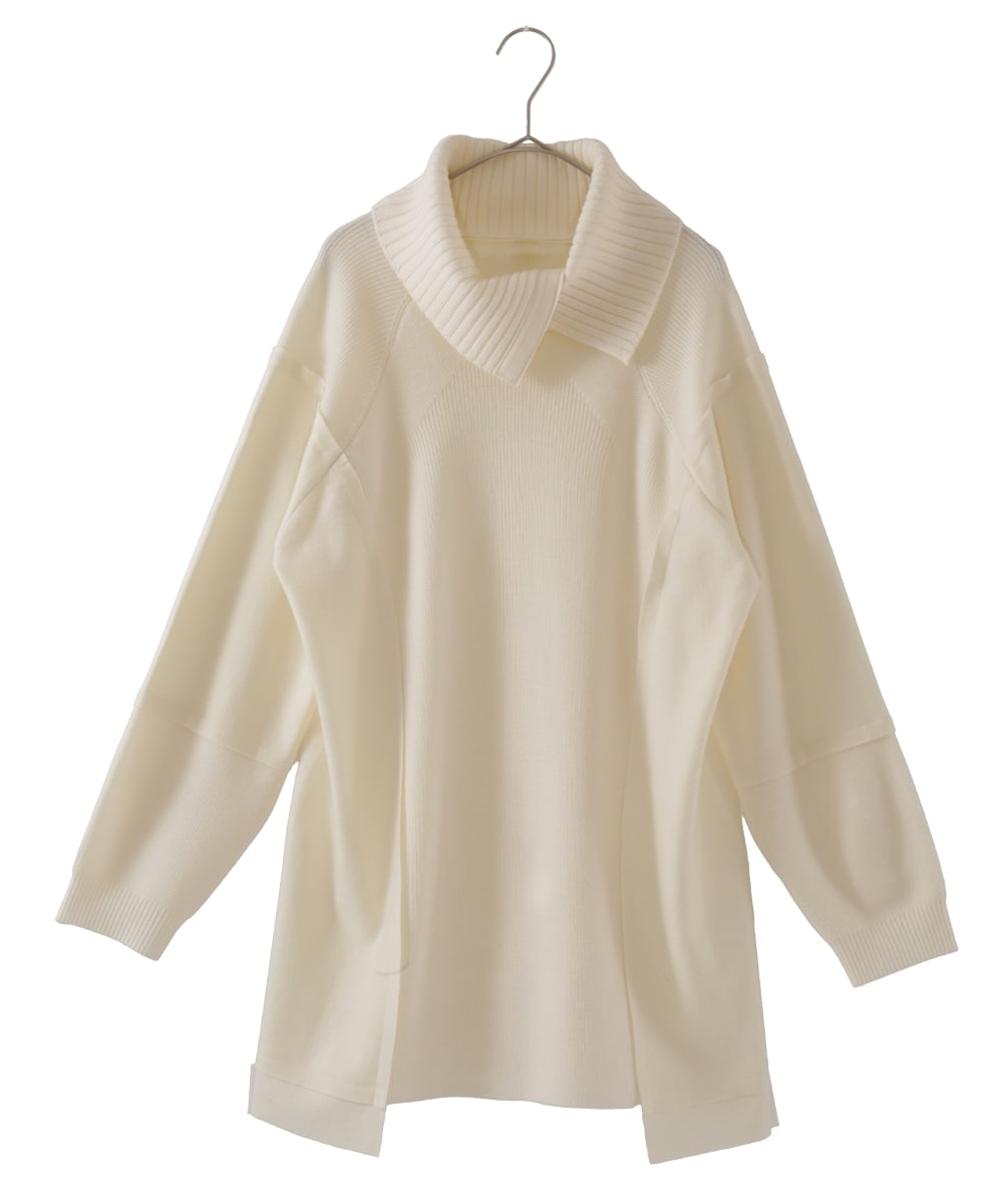 華のあるコートですので優しいカラーのニットやホワイトボトムで爽やかなコーディネートがおすすめです。
