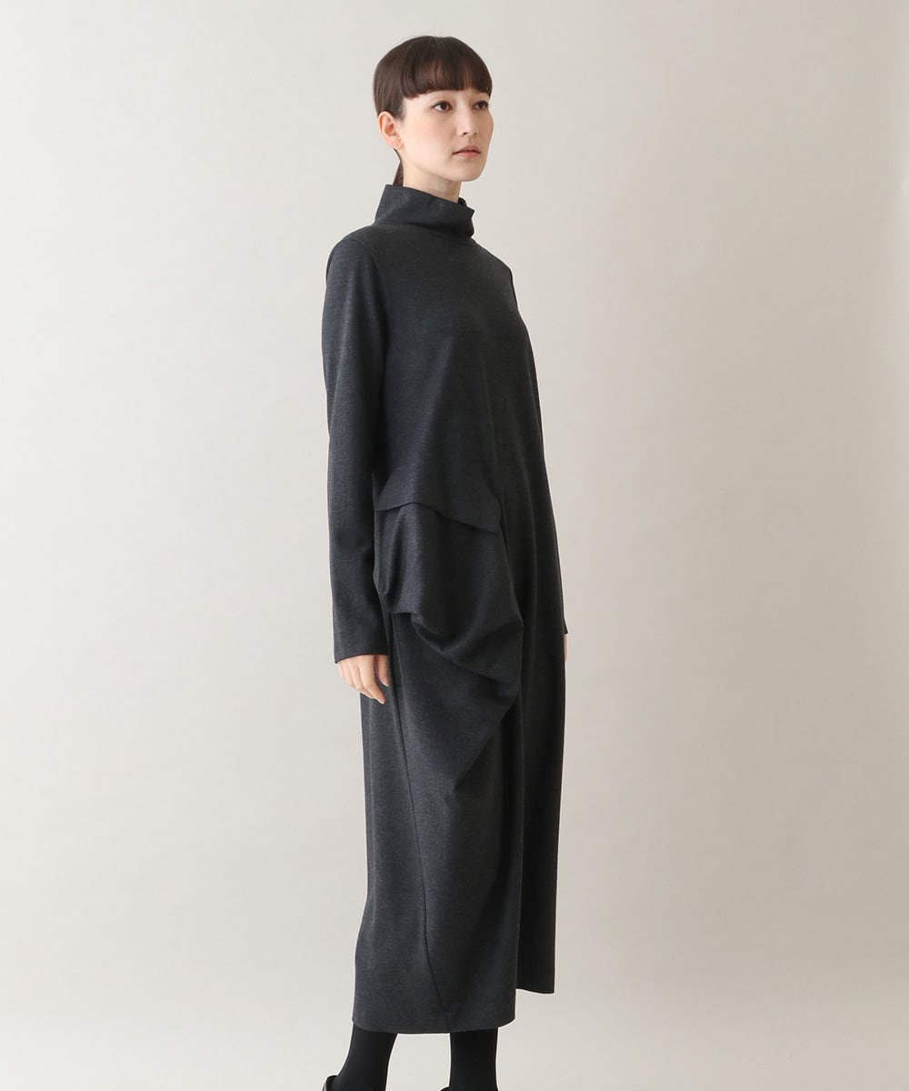 軽くて暖かいウールジャージー素材で仕立てたワンピースです。 ヒロコならではの、折り畳みテクニックでポケット風のディテールを組み合わせた、印象的な目を惹くデザインです。 エレガントさもありながらデイリーにも合わせやすいのもポイントです。
