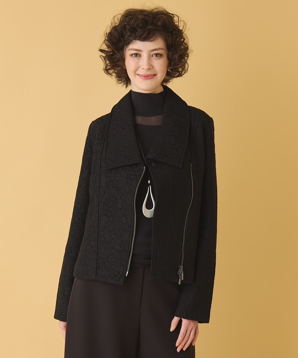 ライダース風のデザインにレースを重ねた、クール✕フェミニンなライダース風ジャケット&カットソー。