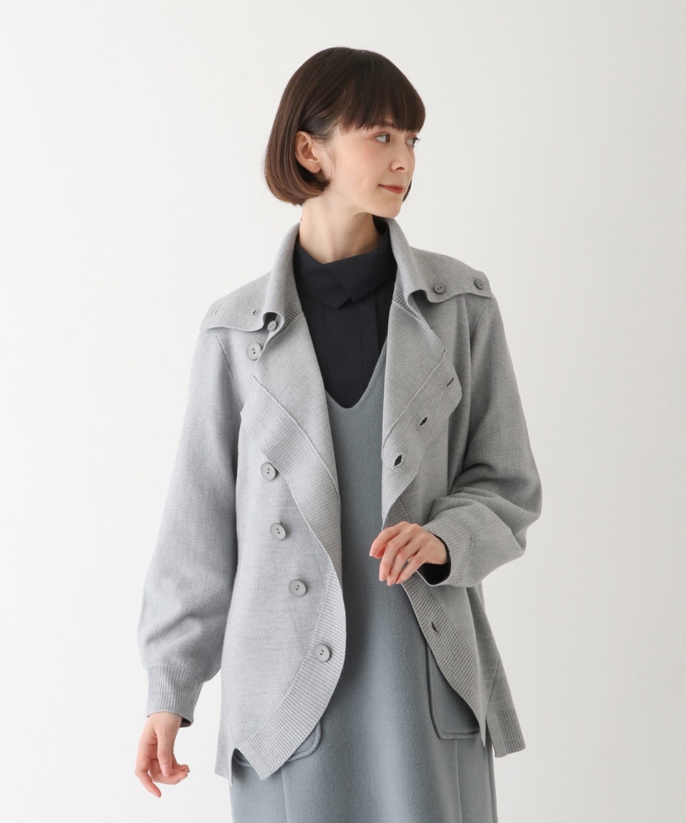 着回せるニットカーディガン、前を閉じてプルオーバー風に着用。