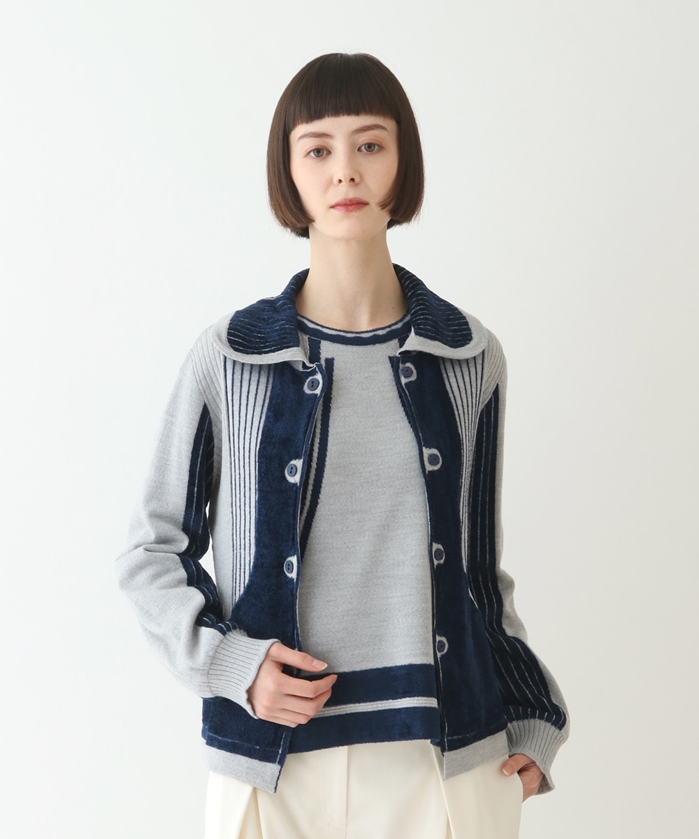 グレー×ネイビーのコントラストが優しさの中にエレガントな表情のカーディガン。丸い衿やふんわりした袖、ボタンアクセントがポイントです。