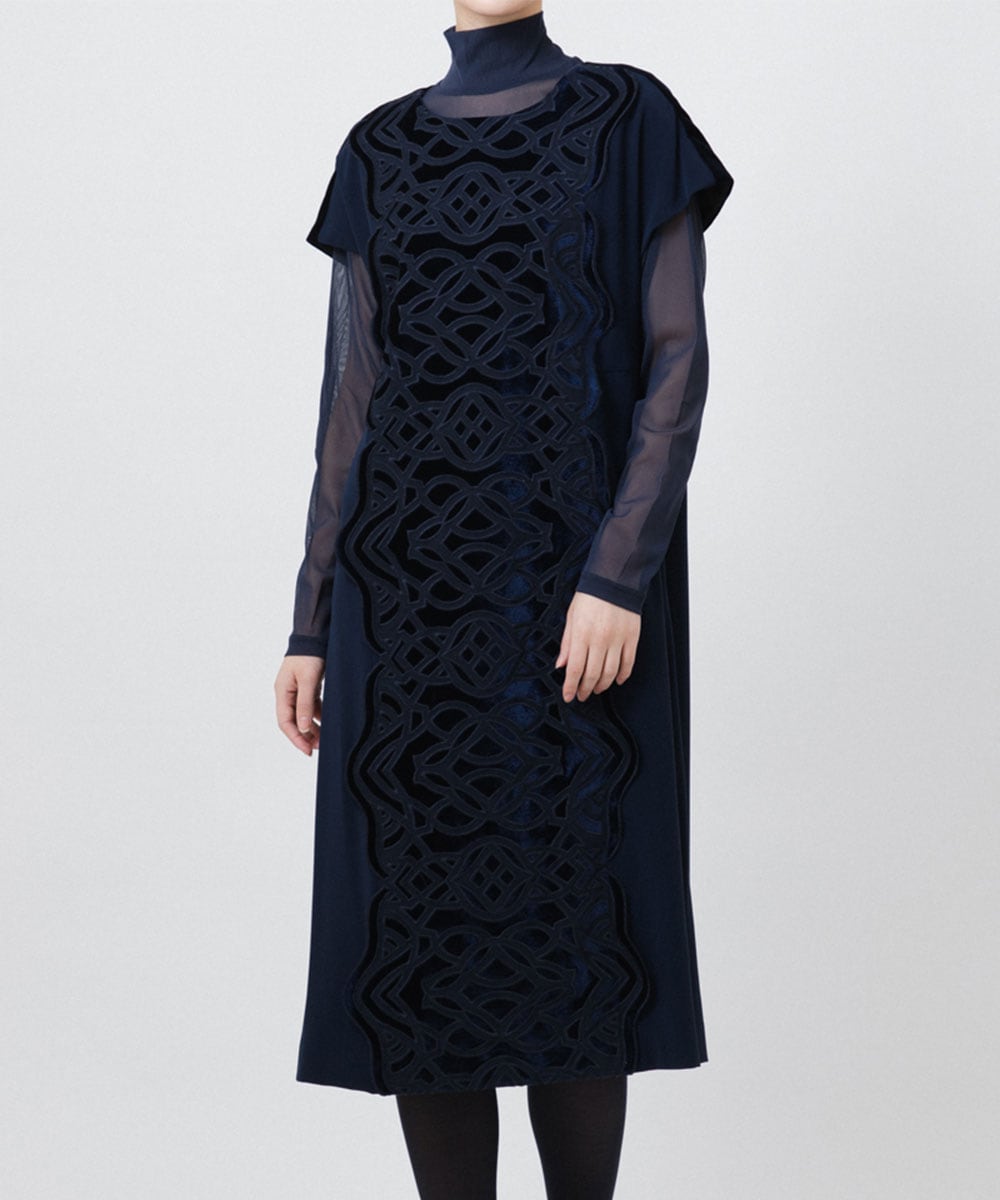 【洗える】ベロア刺繍レースIライン半袖ワンピース