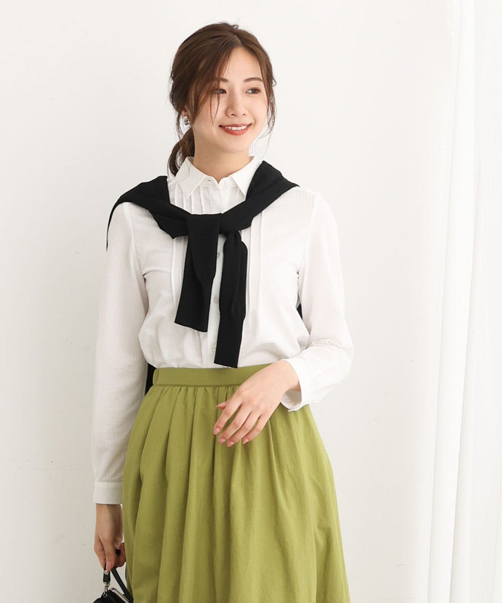 MK定番、伸縮シャツブラウスです。柔らかくハリ感少なめで、カットソーを着ているような着心地感が◎。肩が落ちすぎず、ほどよくすっきりとしたシルエットが合わせるボトムを選ばず着回せそうです。しわになりにくく洗濯機洗い可能で、毎日のお仕事に便利な一枚です。