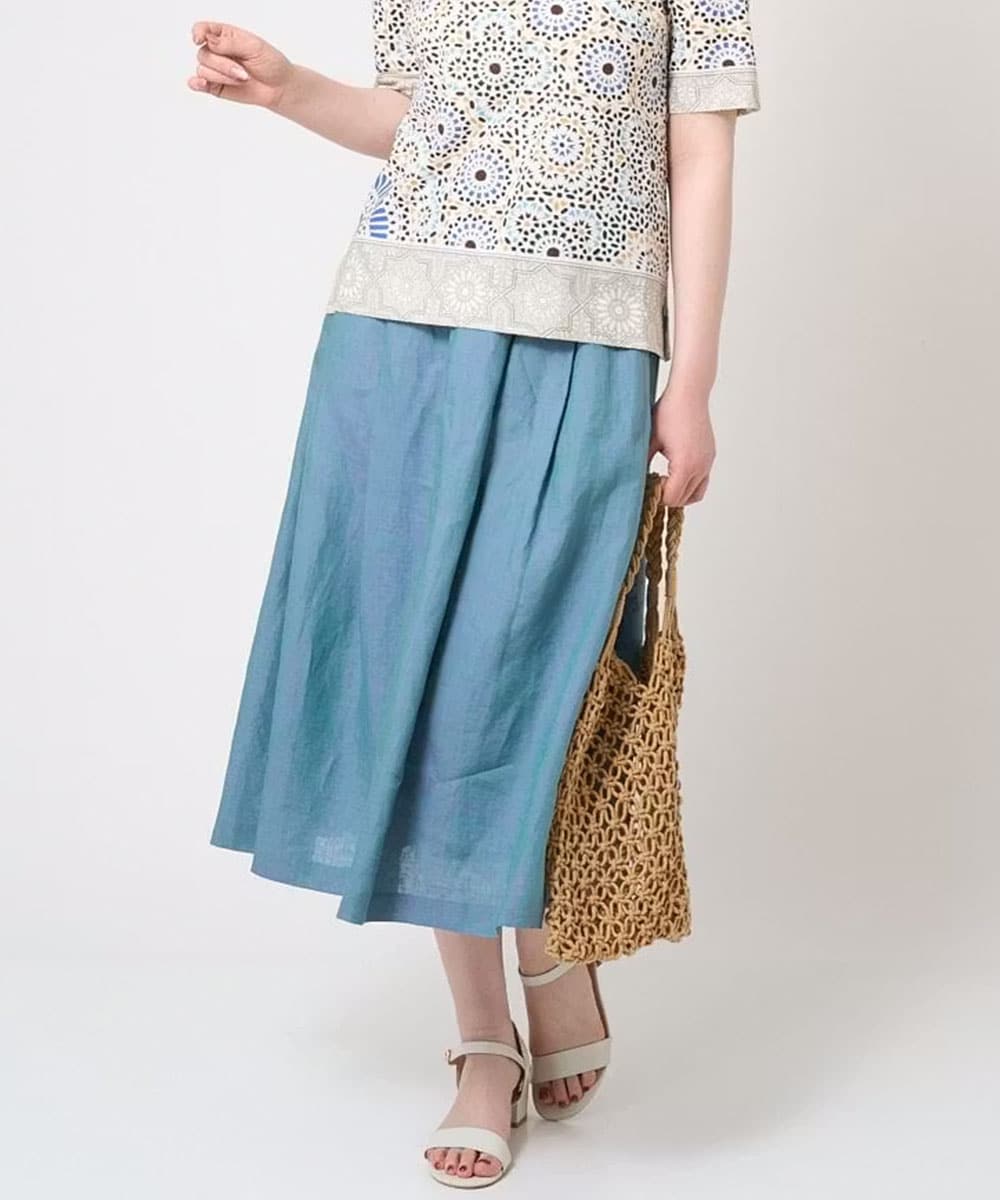 涼しげな印象のシャンブレーリネンスカートです。ウエストはタックを入れた総ゴムのギャザーに仕上げています。光沢感のある生地でカジュアル過ぎないオシャレな着こなしが出来るスカートです。
