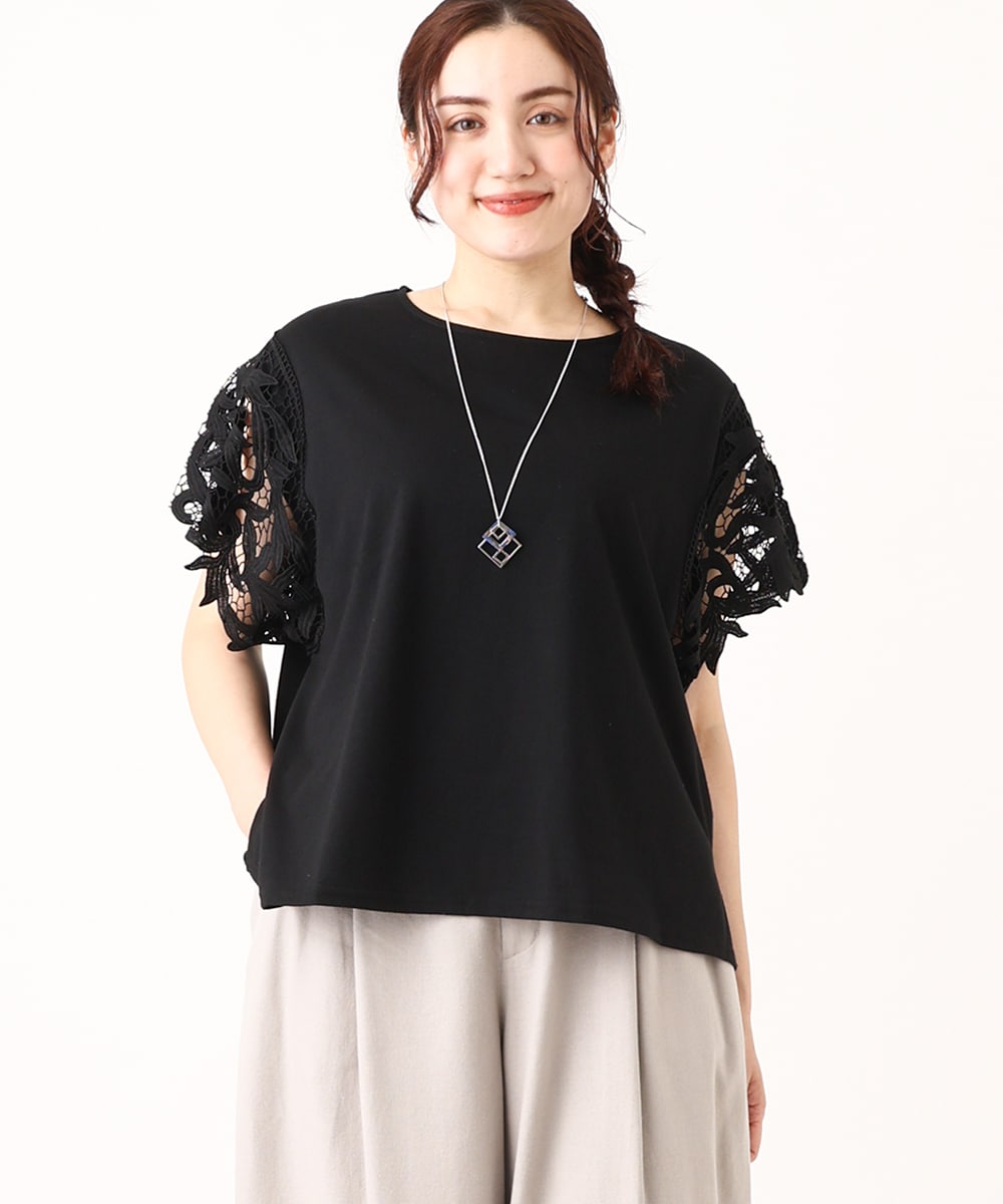透け感のないT/Cテンジクのカットソー素材に袖部分に華やかなレースを合わせています。