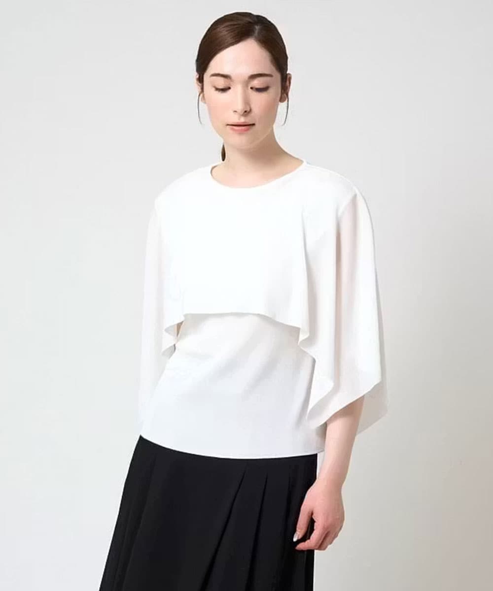 ニット:タンクトップにケープが付いたデザイン。袖は輪郭が分からない位の透け感です。風通し良く涼しい生地です。手洗い不可。ボトムスとの境い目が見えない様にインナー着用をオススメします。