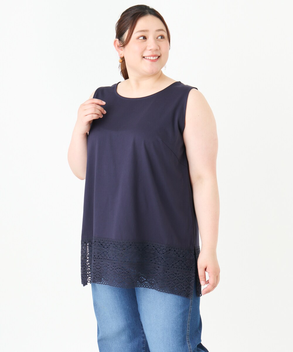 裾回りにコットンレースを2段あしらった、レイヤードにもおすすめのロングタンクトップ。