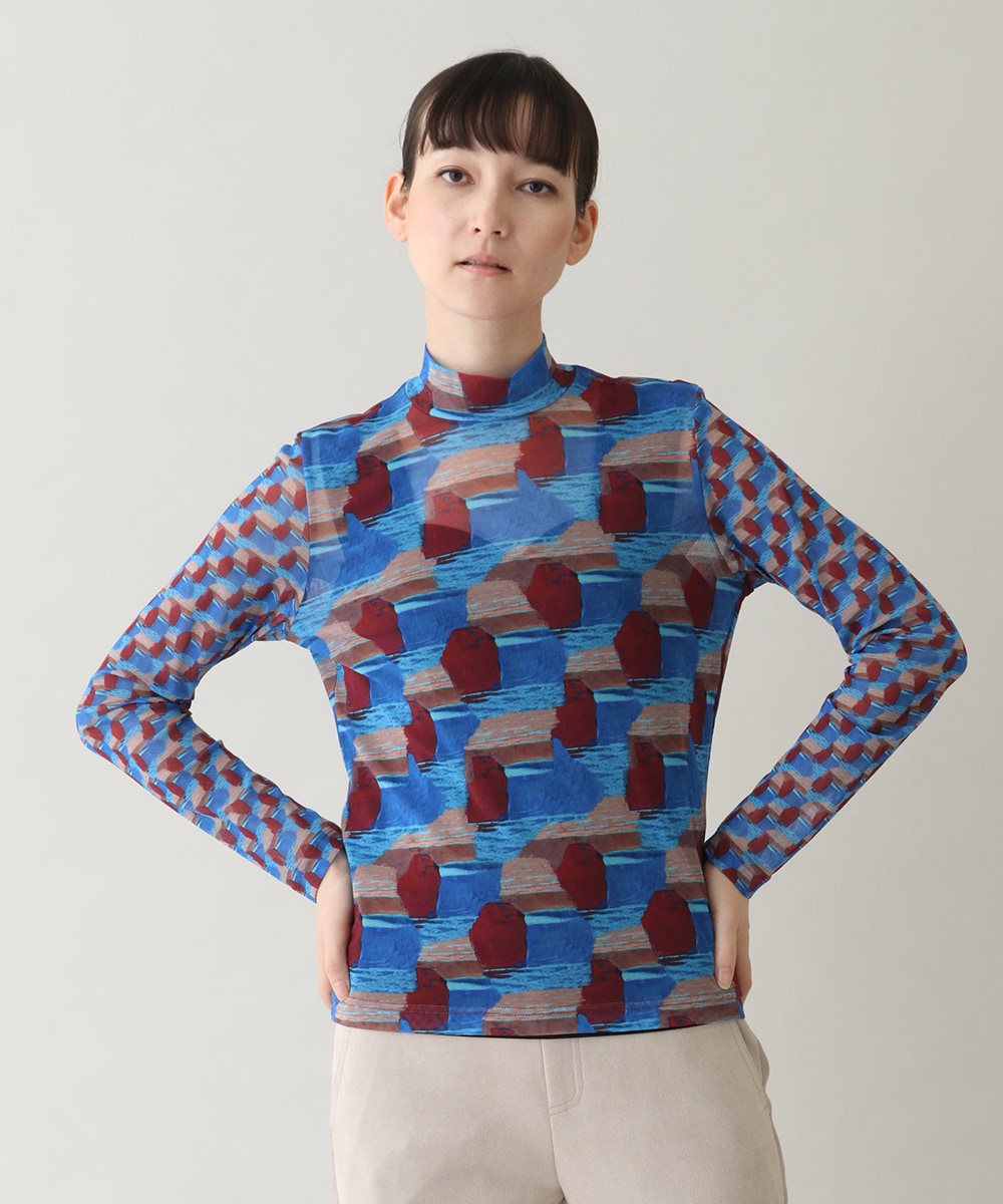 ポリエステルチュール素材で作ったトランクのハイネックのカットソー。身頃と袖のプリントの大きさを変えていますのでスッキリ見えますね。チュールのカットソーはチャチャッと洗えてすぐに乾くので、