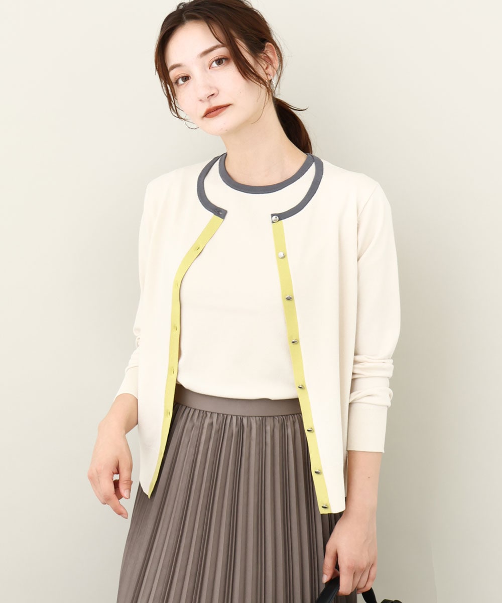 配色を効かせたカラーがお洒落なアンサンブル。ショート丈カーディガン×半袖ニットの