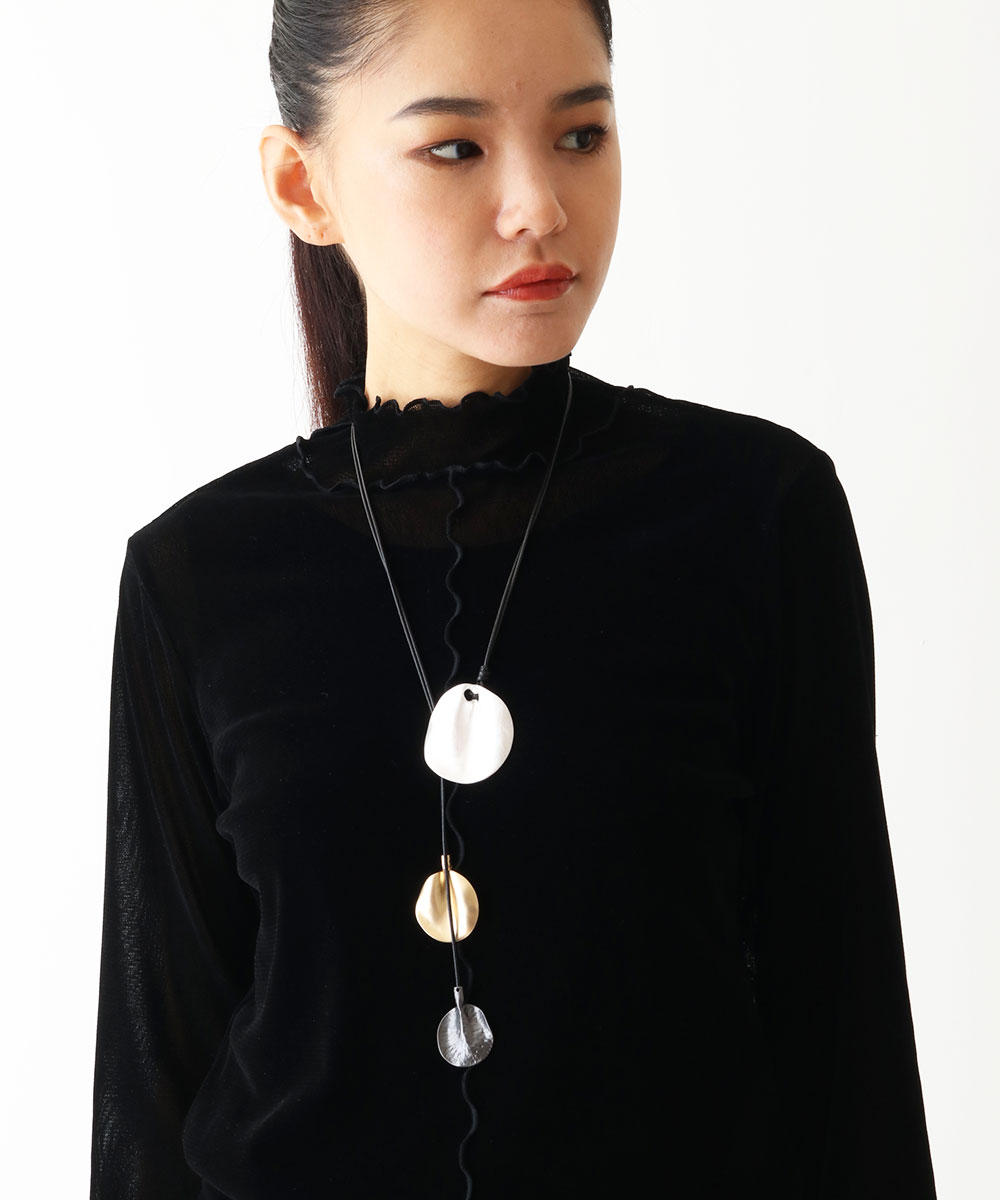ニットはストレッチの効いたニット素材と裾にハリ感のあるタフタ素材をジョイントしたおしゃれな一枚です。ペプラムの様なプリーツを 畳んだタフタがポイントの女性らしいデザインです。一枚で上品に着用できて腰まわりをカバーしてくれます。
