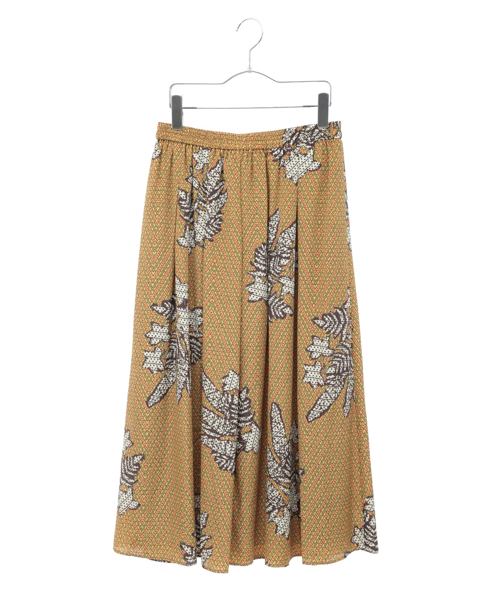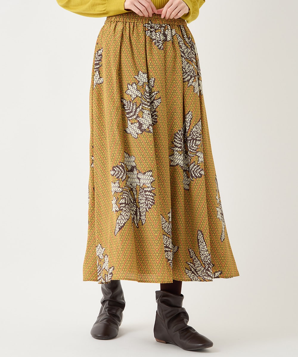 ヘリンボーンドット柄とボタニカルプリントを加えた印象的なスカート。肌触りも良く動くたびに揺れる裾が綺麗です。ウエストゴムでラクな穿き心地です。