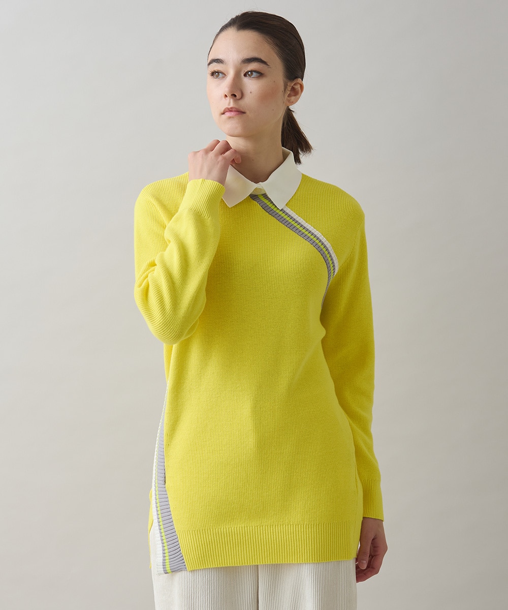 シックなアウターにイエローで明るさをプラス。コットン94%にウール6%の肌触りの良いプルオーバー。異素材の衿がジョイントしたポロシャツ風デザイン。リブテープがアクセント。