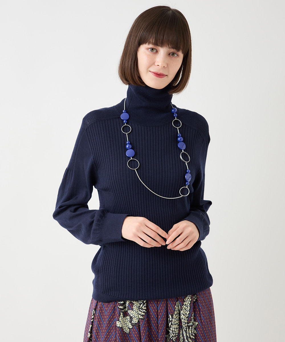 衿の重なりのデザインがポイントのブラウスにインナーとしても活躍してくる着心地抜群のタートルネックニットをインしウエストゴム仕様の幾何ボタニカルのプリントスカートを合わせました。