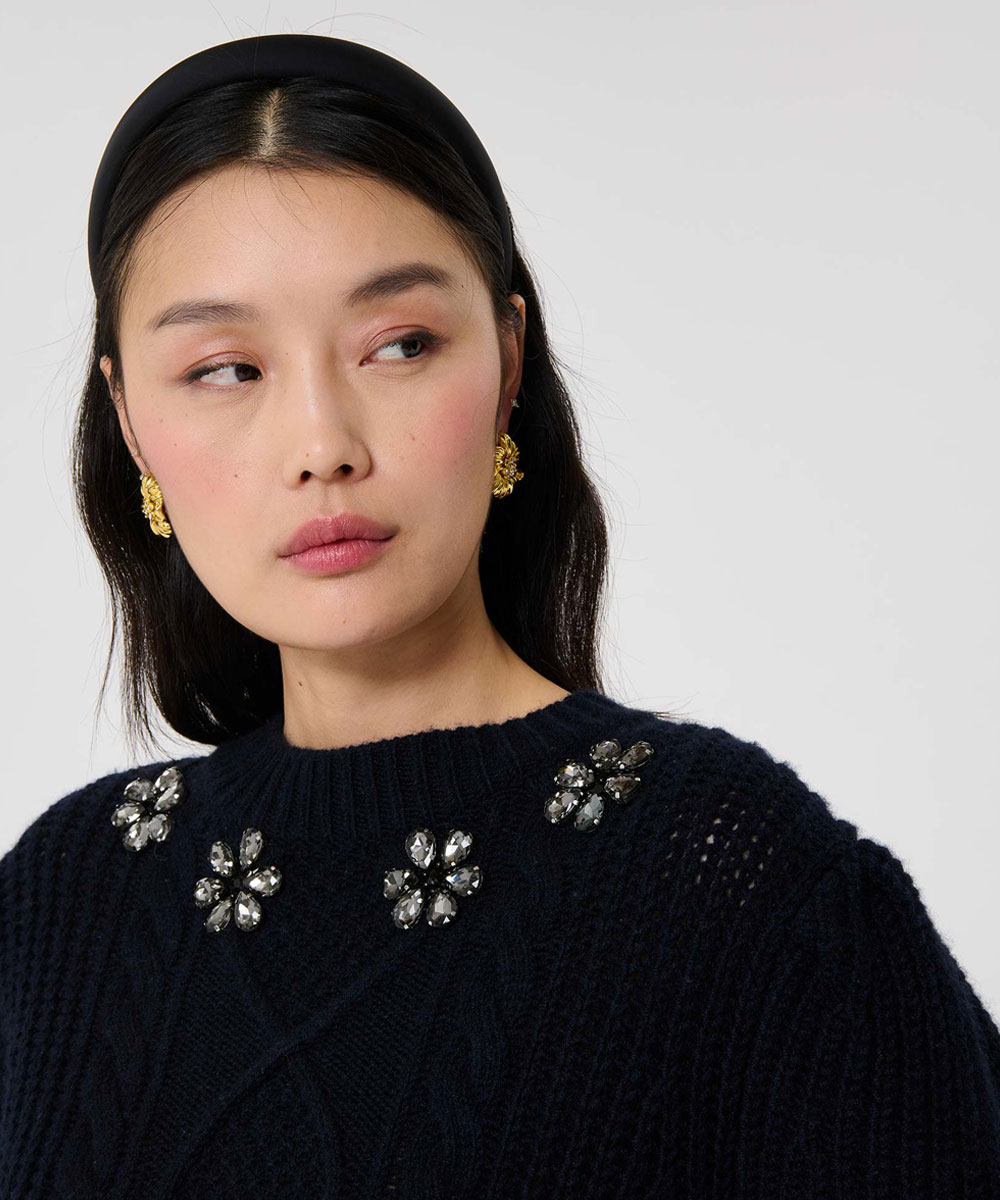 フラワーデザインのビジューが目を惹くニットはボリューム感のあるお袖がポイント