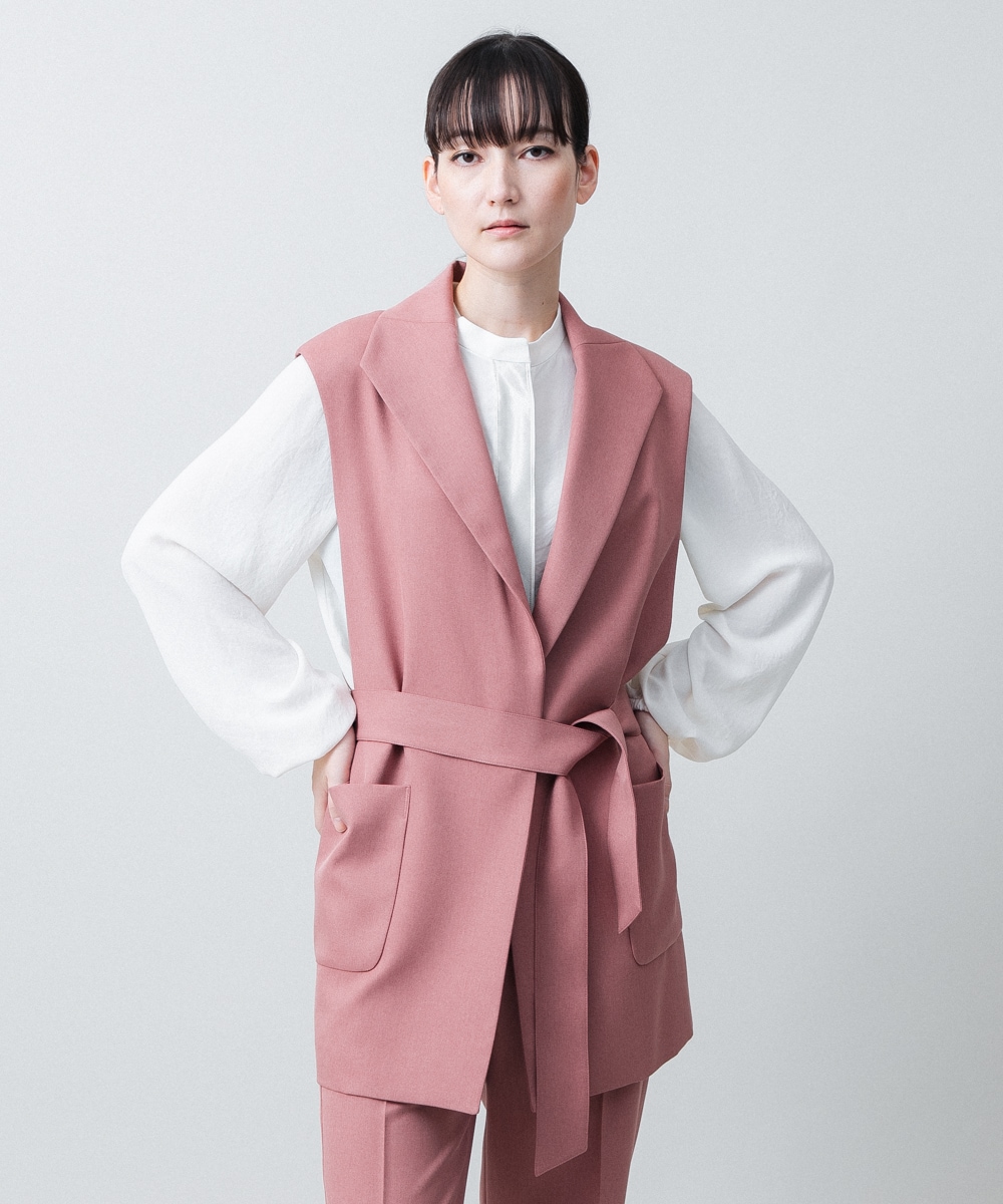 華やかなピンクのベストジャケットは、パウダリーなウール見えするポリエステル素材で取り扱いが楽なので気軽に着用できます。
