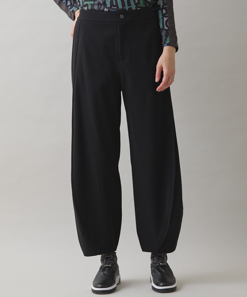ボトムは、ストレッチ性があり動きやすいパンツ。裾に丸みがあるオシャレなシルエットで存在感のあるデザインです。
