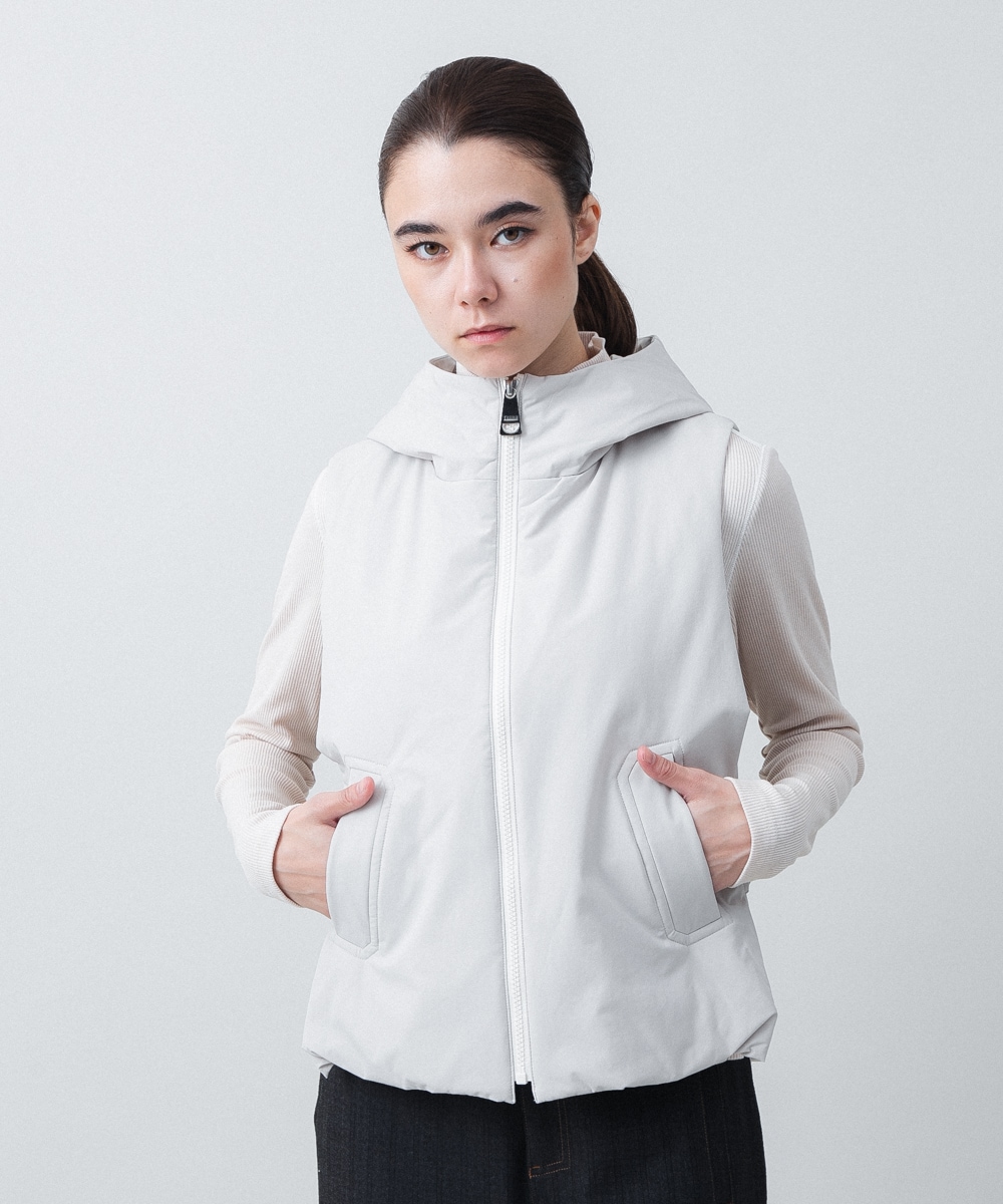 上に羽織っているのは中綿入りのタフタ素材で作ったとても軽いトランクのベスト。コート下にライナーがわりに着ていただいても可愛いですしあると便利なアイテムです。サイドがベルトで繋いでるデザインになっていますので、厚手のニットの上でも楽に着ていただけますよ。