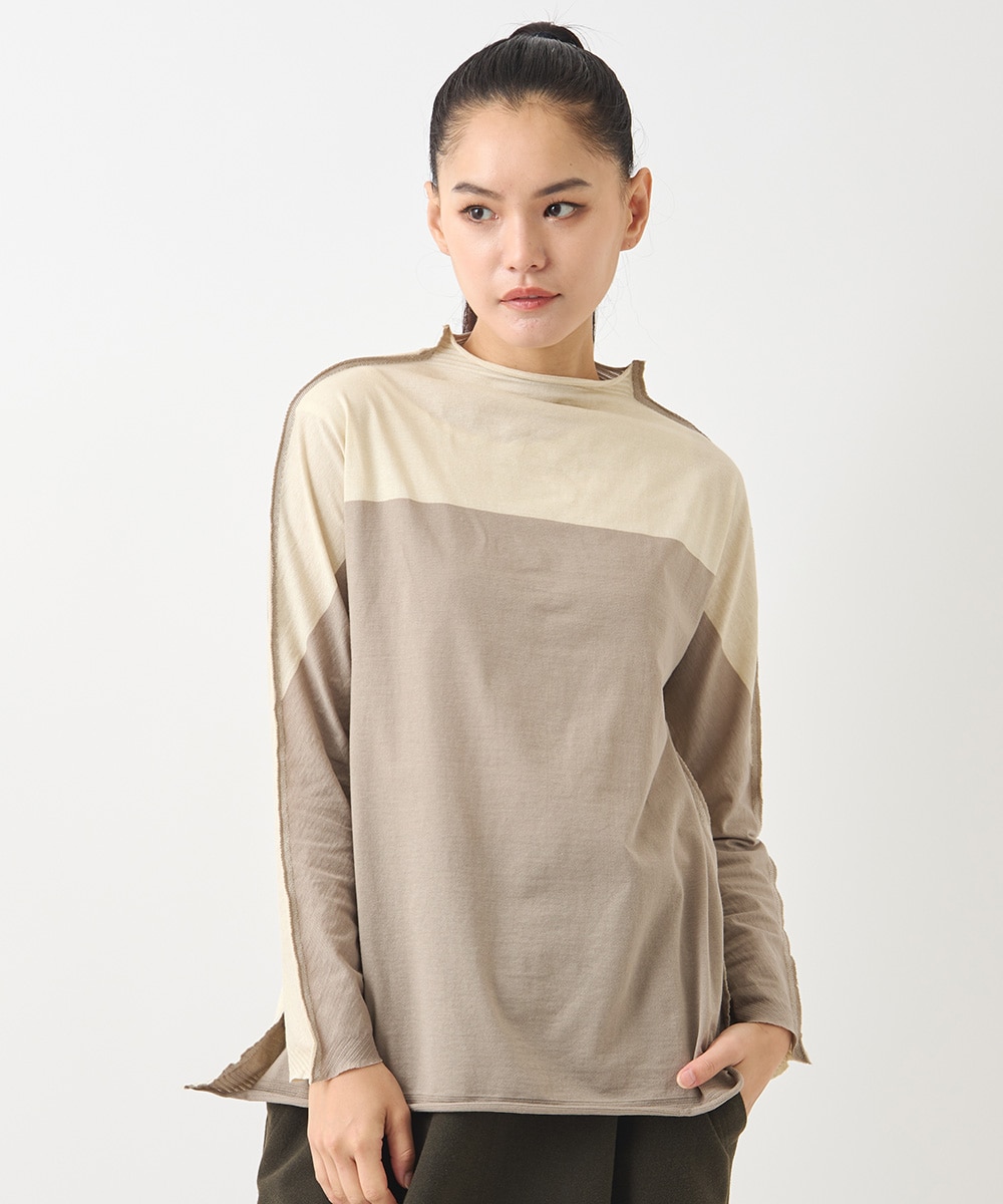 着心地の良いシンプルな無縫製のカットソーはウール素材が苦手な方に冬のコットン混インナーとしておすすめです。ウエストゴム仕様のプリントギャザースカートを合わせました。