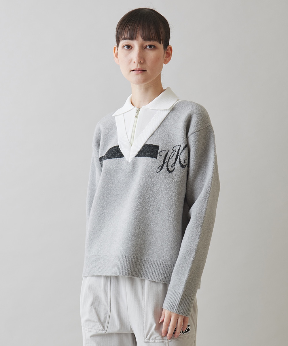 2種類の糸で素材の変化があるポロニットです。ゴルフシリーズのため軽く保温性が抜群です。身頃はふくらみ感のあるニット、ポロ襟はすっきりとした糸できちんと感があります。重ね着しているような雰囲気ですが一枚でスタイリングが決まります。
