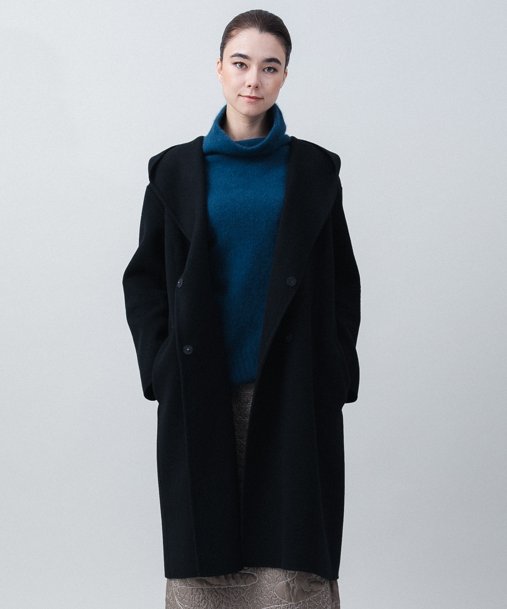 上質な細番手で仕立たウールデザインコートです。程よいマキシ丈で包みこんでくれる丸みのある雰囲気が女性らしい一着です。フード風に付けた小顔効果に期待出来るショールカラーが大人のゆとりコーデを引きたたせてくれます。