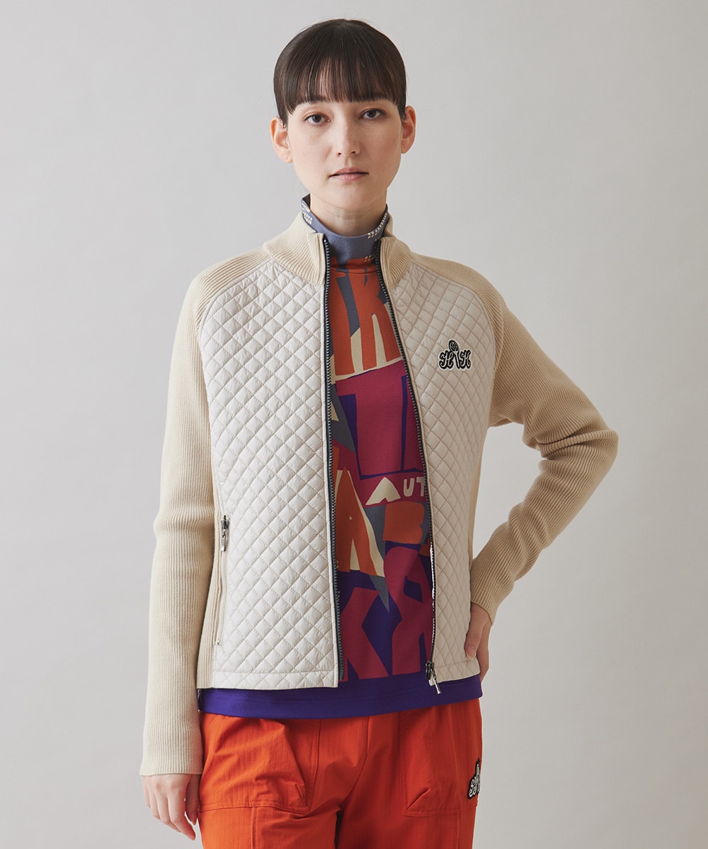ジャケットはTRUNKGOLFのキルトとリブレニットのドッキングジャケット。軽く暖かく伸びやかな着心地のジャケットです。