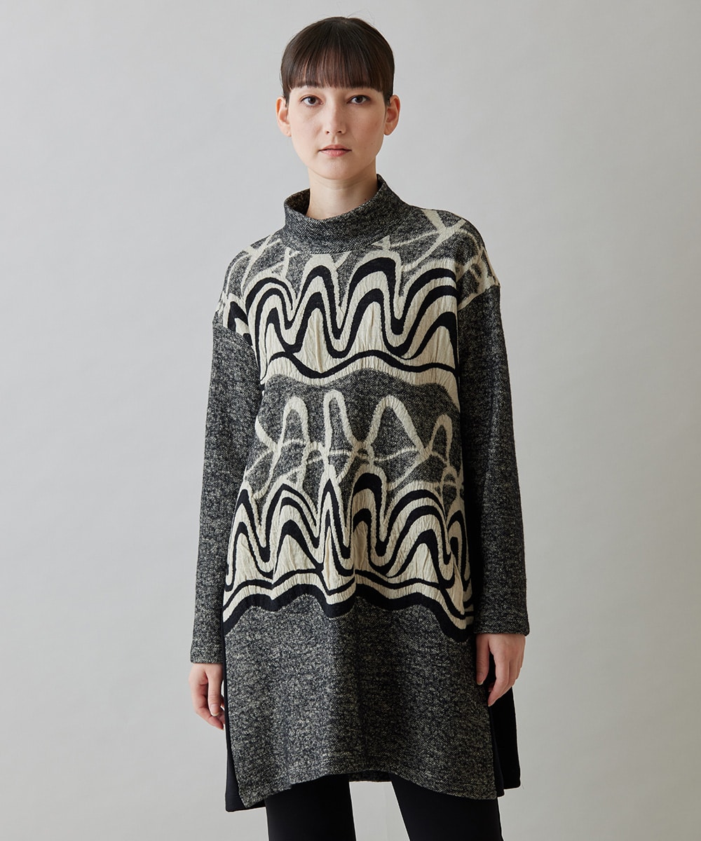 ウェーブモチーフジャガードチュニックは見た目に存在感と雰囲気のある1枚で…ジャガード織りで表現した凹凸感のある風合い×アールデコ風のウェーブモチーフがコーデのアクセントに…。