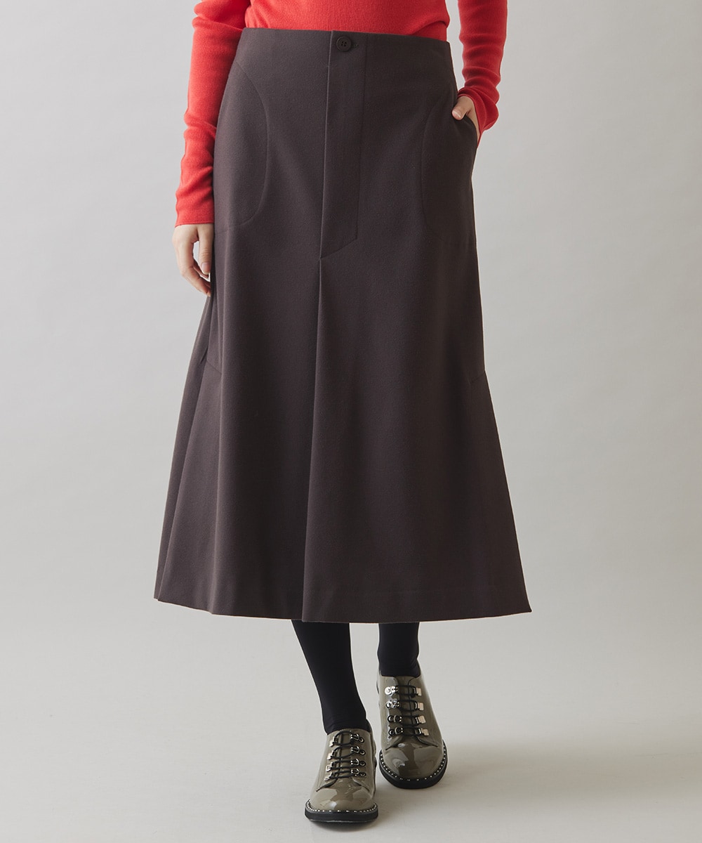 ボトムは、ウール調のフレアスカート。暖かく肌触りが良く、スッキリ見える着丈でとデザインで低身長さんにもバランス良く着用いただけます。