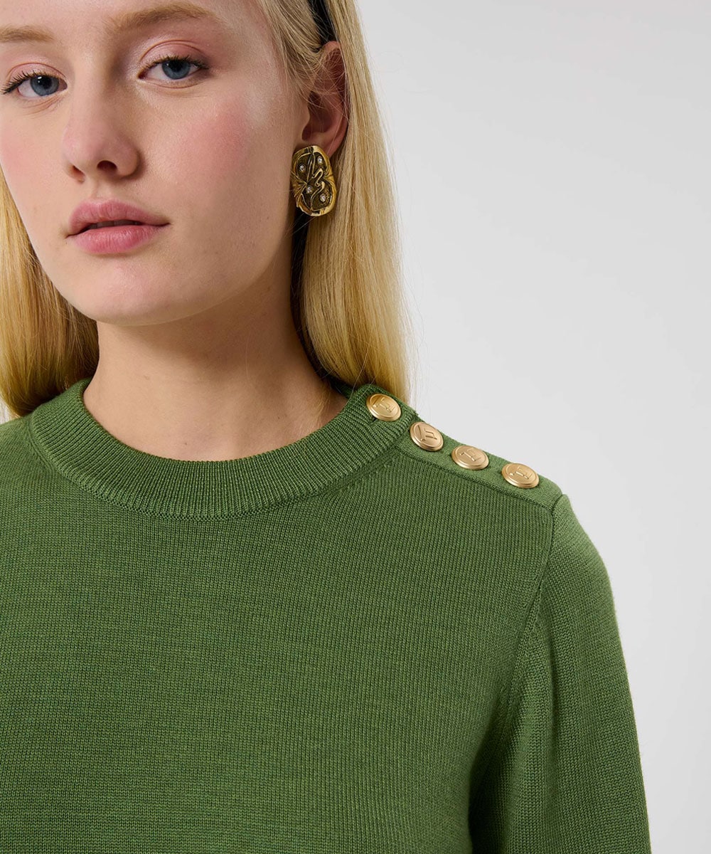 肩のTJボタンがアクセントになるニットはほどよい厚みとシンプルなクルーネックで上品な印象