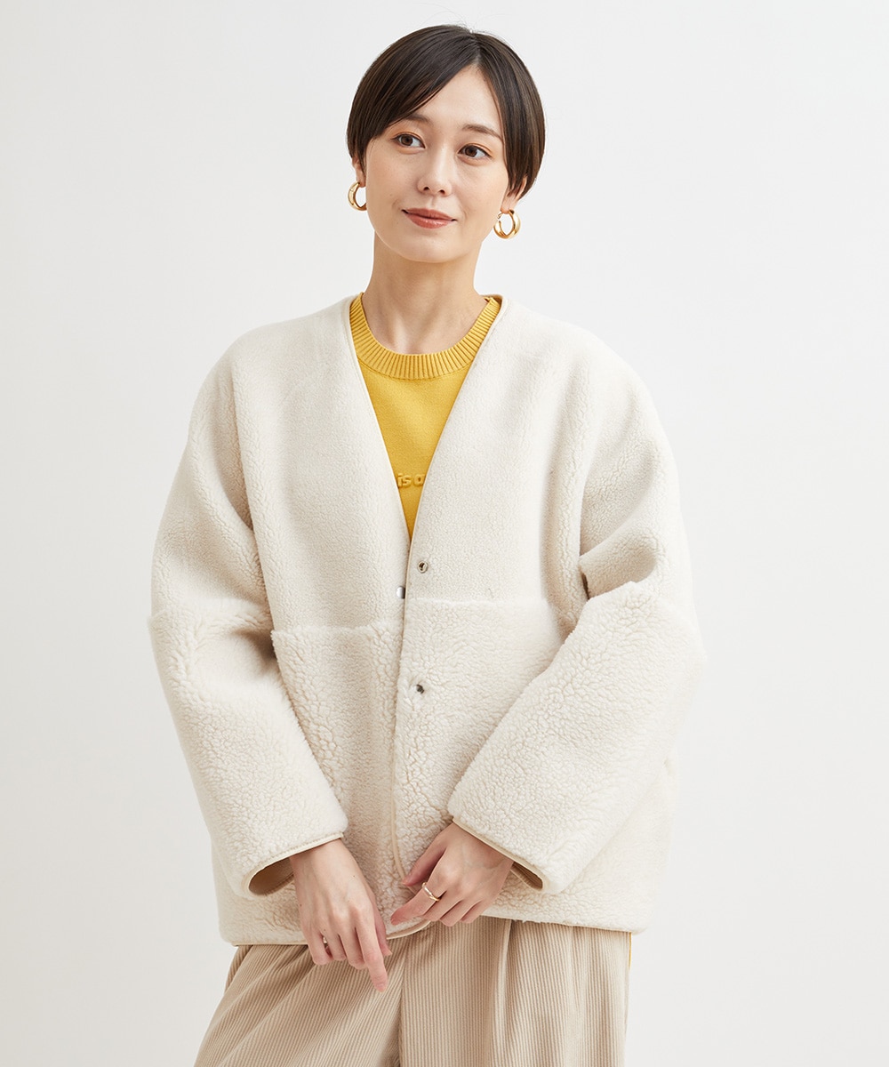 コート:リバーシブルのファーコート。風を通しずらく、真冬にも着れる素材。見た目より軽く、スッキリとしたデザイン。オーバーサイズのニットなどをインナーに着ても、着ぶくれしません。