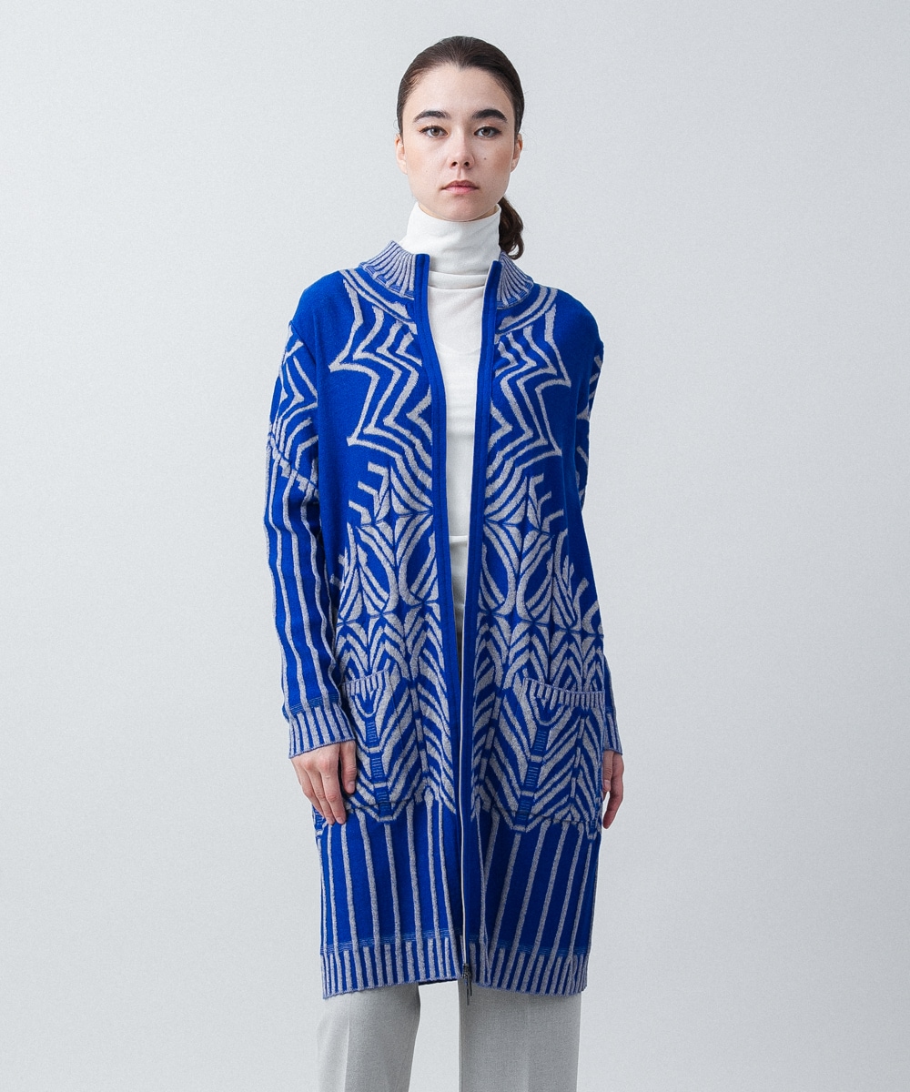 幾何柄のヒロコのリンクスジャガードニットカーディガン。前を開けて羽織って着ていただいてもいいですし、閉じてワンピース風に着ても素敵ですよ。ダブルファスナーなので裾のファスナーを開けていただく事も出来ます。ソフトにフィットして着心地もとても良い綺麗な色のカーディガンです。