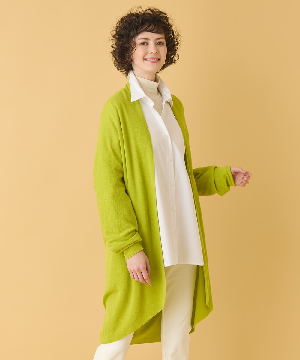 カーディガンはボタン無しの、サラッと羽織れるラクラクです。お尻も隠れて便利な1枚です。あまりゴツくないので、コート下に着れます。