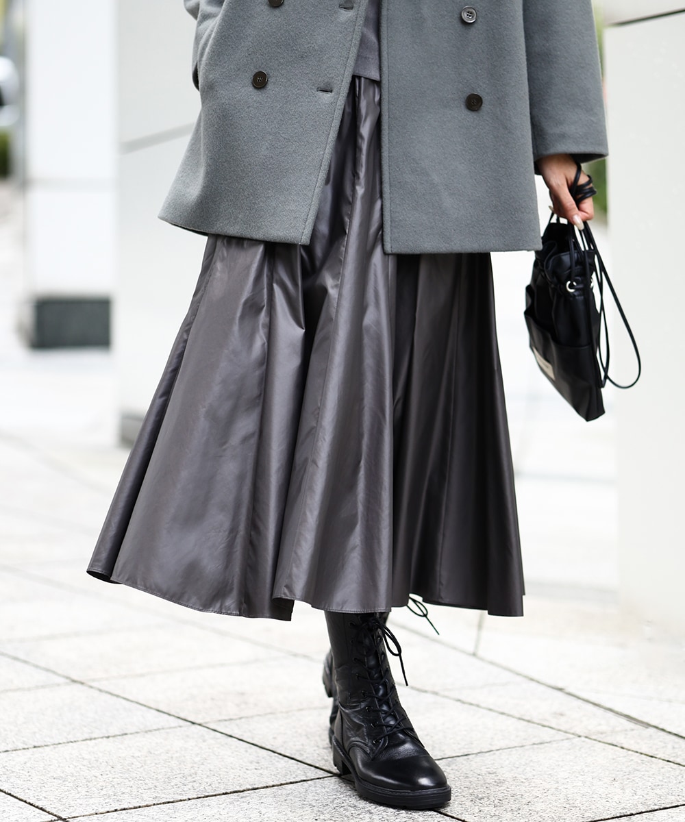 薄手のタフタ生地の表面にレザー見えする加工を施した大人のフレアスカート。