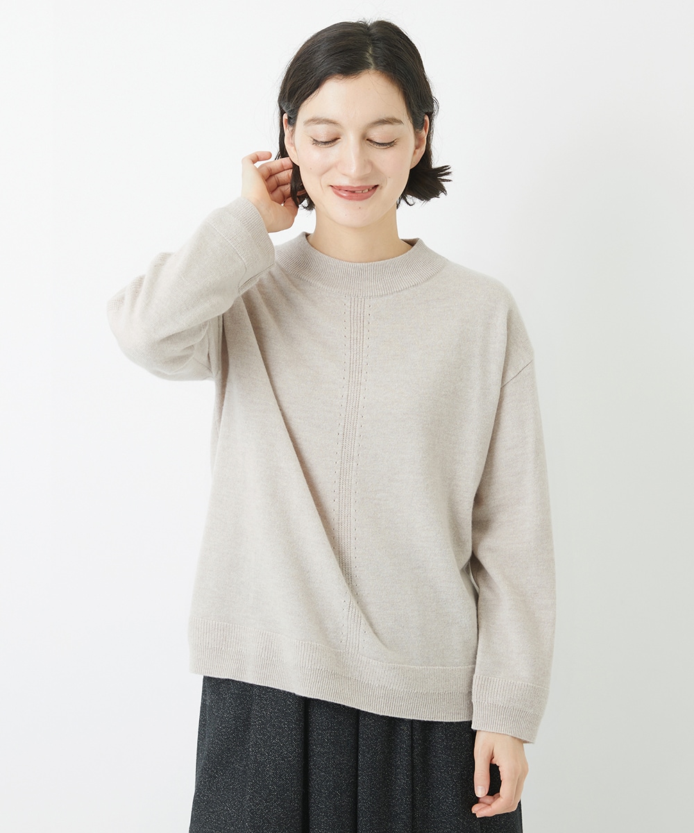 滑らかな肌触りのニットはウール100%‼︎ゆったり軽い着心地です。シンプルな中に前身頃のアイレットがアクセトに。