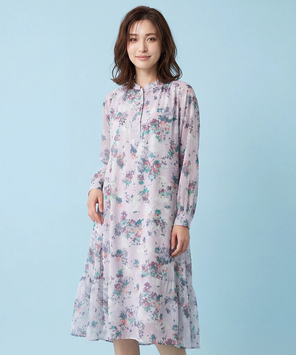 ワンピースは柔らかいポリエステルのシフォン素材を使用した春らしいパステルカラーのボタニカルプリントで、カッティングにこだわった一枚です。同素材のボウタイ付きで甘めな印象がありながら、肩回りの立体的なモード感とゴムシャーリングの女性らしさがポイントのアイテムです。