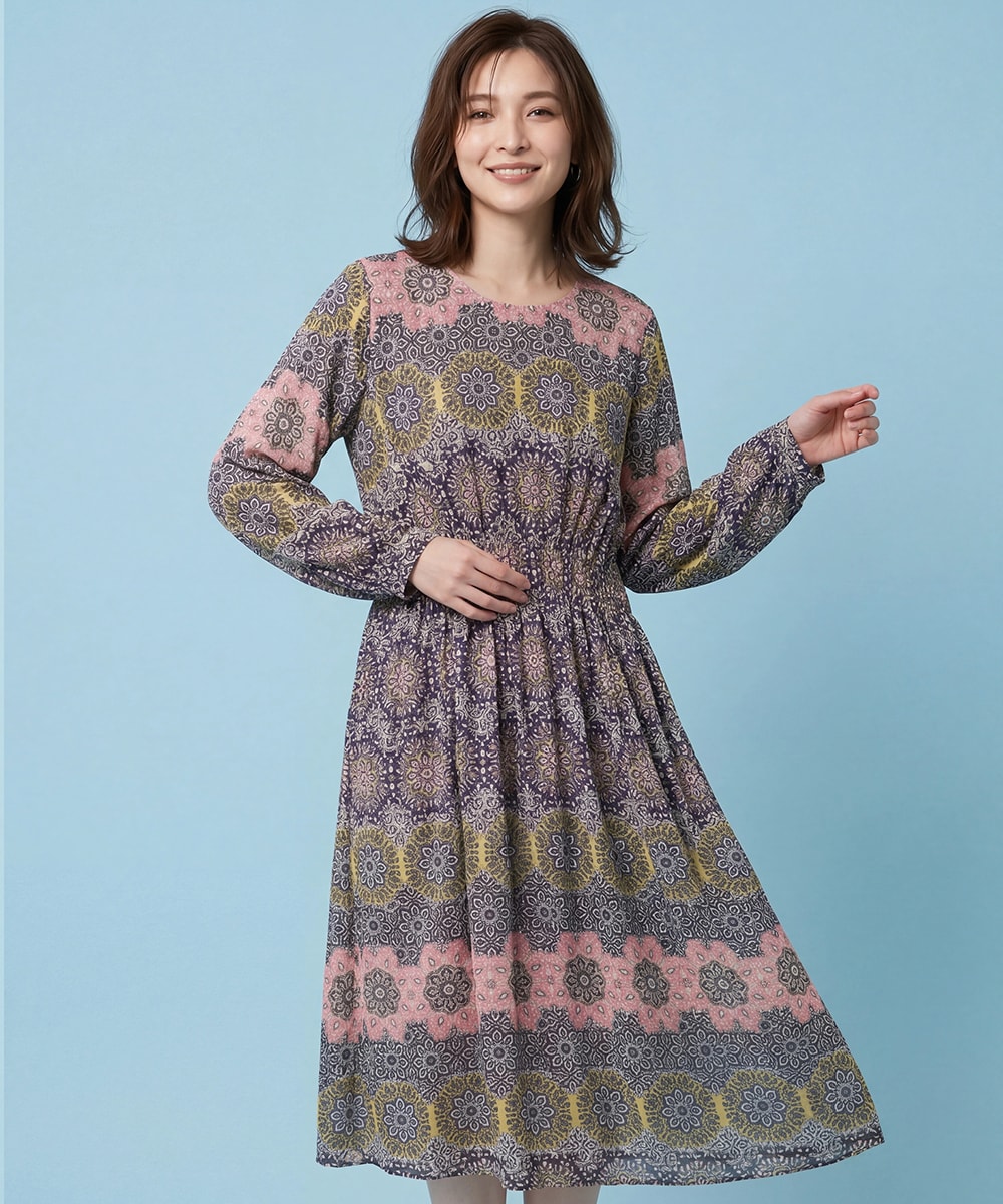 ヴィンテージ風モチーフ総柄ワンピース /洗濯機で洗える