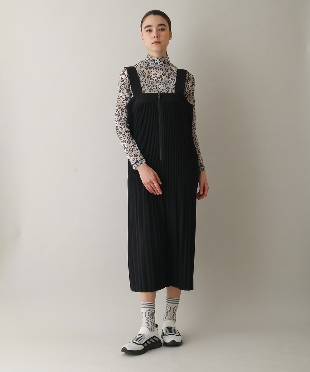 クリスタルプリーツ、縦長のナローシルエットが美しいジャンパースカートです。プリーツ幅に強弱をつけたテクニカルなディテールが大人のエレガンスカジ