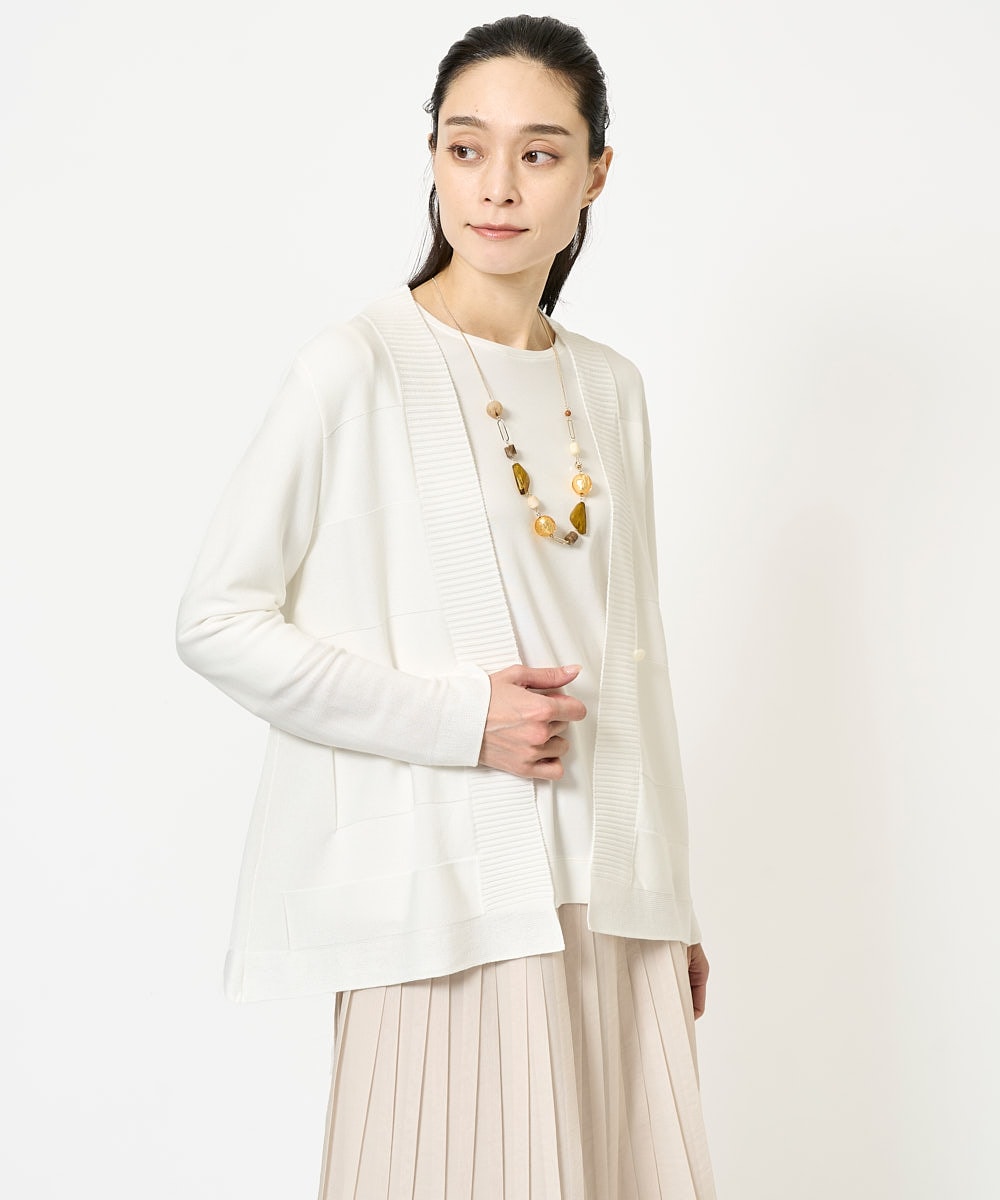 マルチカラーのストライプと細いリボンがポイントの大人かわいいブラウスです。光沢とシアー感があり初夏に気分の上がる一枚です。
